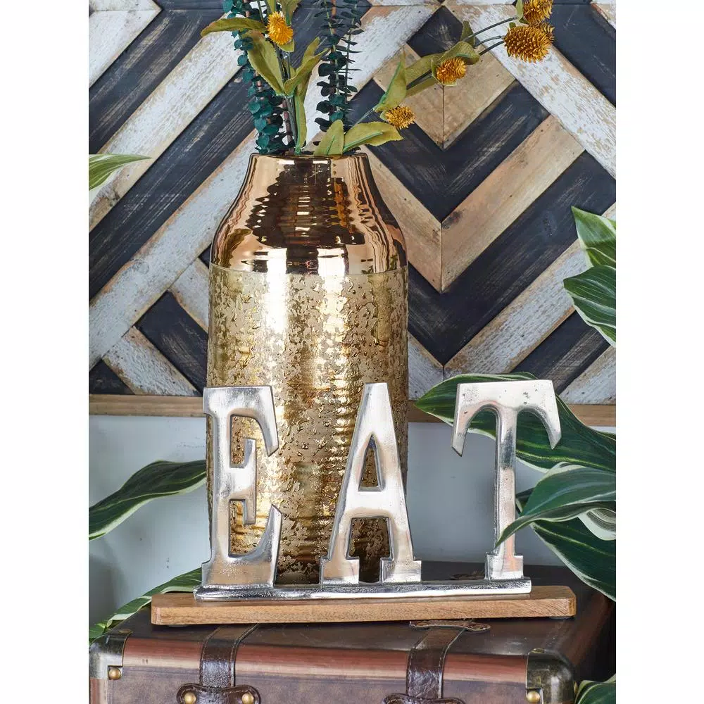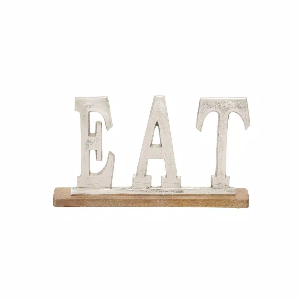 This decorative standing sign features aluminum cut-out capital letters spelling the word “EAT” on an aluminum strip, adding a whimsical touch to homes and spaces. This sign’s rectangular mango wood base provides stability and keeps it upright. The blemished silver and oak brown finishes of this standing sign provide a rough and rugged look.