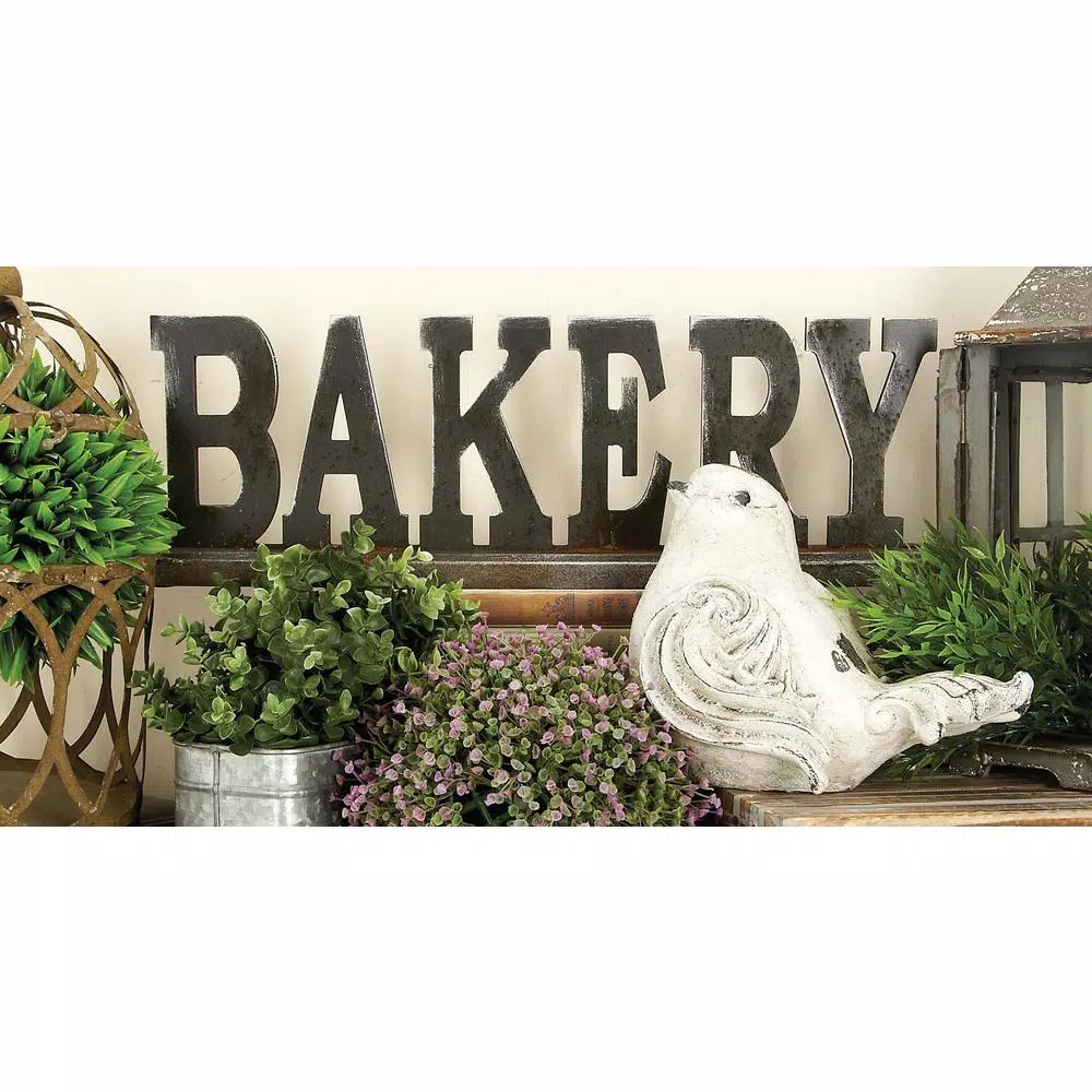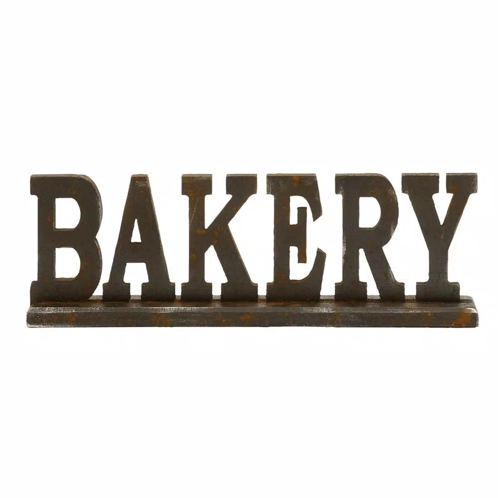 - Features wooden uppercase letter cutouts spelling the word “BAKERY”