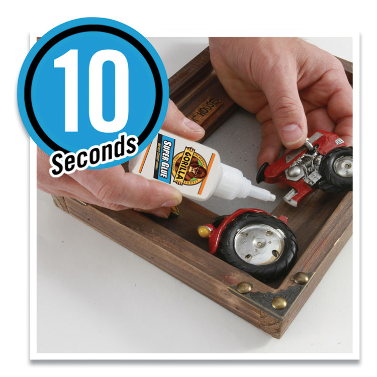 High strength and quick set time make Gorilla Super Glue the go-to for a variety of projects. Developed for long-lasting repairs in an instant, and designed with an impact-tough formula to handle bumps and drops with a strong, reliable bond. Anti-clog cap keeps glue from drying out. Fast-setting and dries in 10-45 seconds with no clamping required. Versatile and bonds plastic, wood, metal, ceramic, rubber, leather, paper, and more. It’s Gorilla Tough use after use.