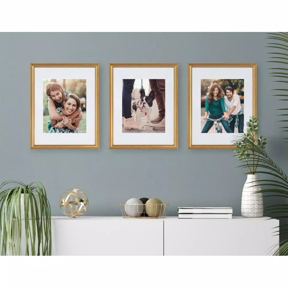 Family photographs should be displayed where they can be a constant reminder that time spent with family and friends should be remembered and enjoyed by everyone. Sharing those photos is a joy that brings not only you satisfaction but also entertains your guests. Done right, and you have a timeless collection of your best times captured in one lovely customized view on your favorite wall. A pleasure to view every day and fun to add to over time. The Kate and Laurel Adlynn glam gold frame set helps you tell your story creatively, tastefully and with the theme, you have in mind. Each frame fits an 8 in. x 10 in. photo with the included white mat or an 11 in. x 14 in. photo without the mat. The outside dimensions of each frame are 12 in. x 15 in.