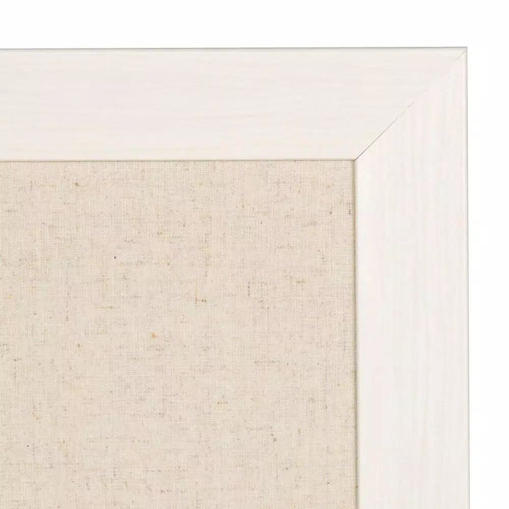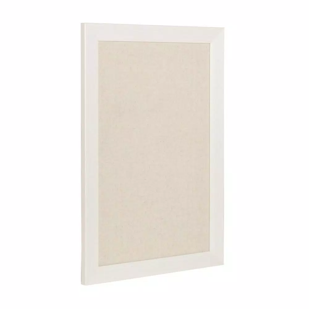 Organize your home or office with this decorative and functional framed linen fabric pinboard. This decorative wall mounted memo board has a soft white linen fabric padded pinboard. Four metal pushpins are included to easily post reminders, photos or important memos. Metal d-ring hangers are already attached to the back of the frame for either horizontal or vertical display to fit your needs. The outer display dimensions are 18 in. by 27 in. by 1 in. deep. The fabric pinboard measures 14.5 in. by 23.5 in. Use this framed bulletin board for maximum organization in your entry way, kitchen or home office.