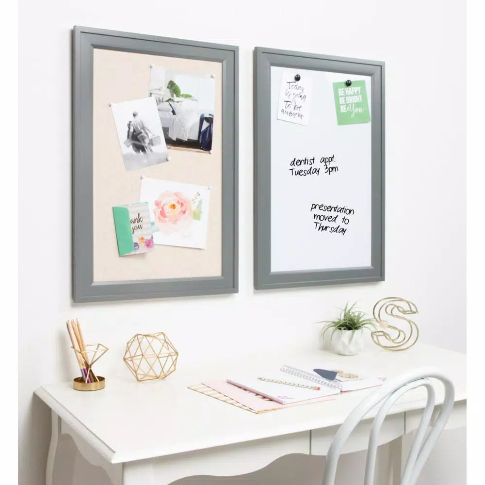 - Decorative framed magnetic dry erase board for home or office wall organization in a casual style frame with a gray finish