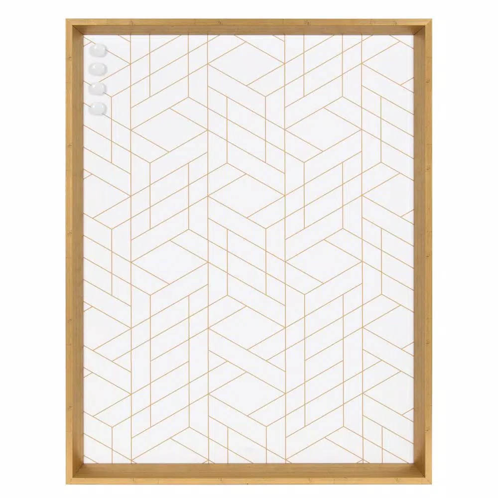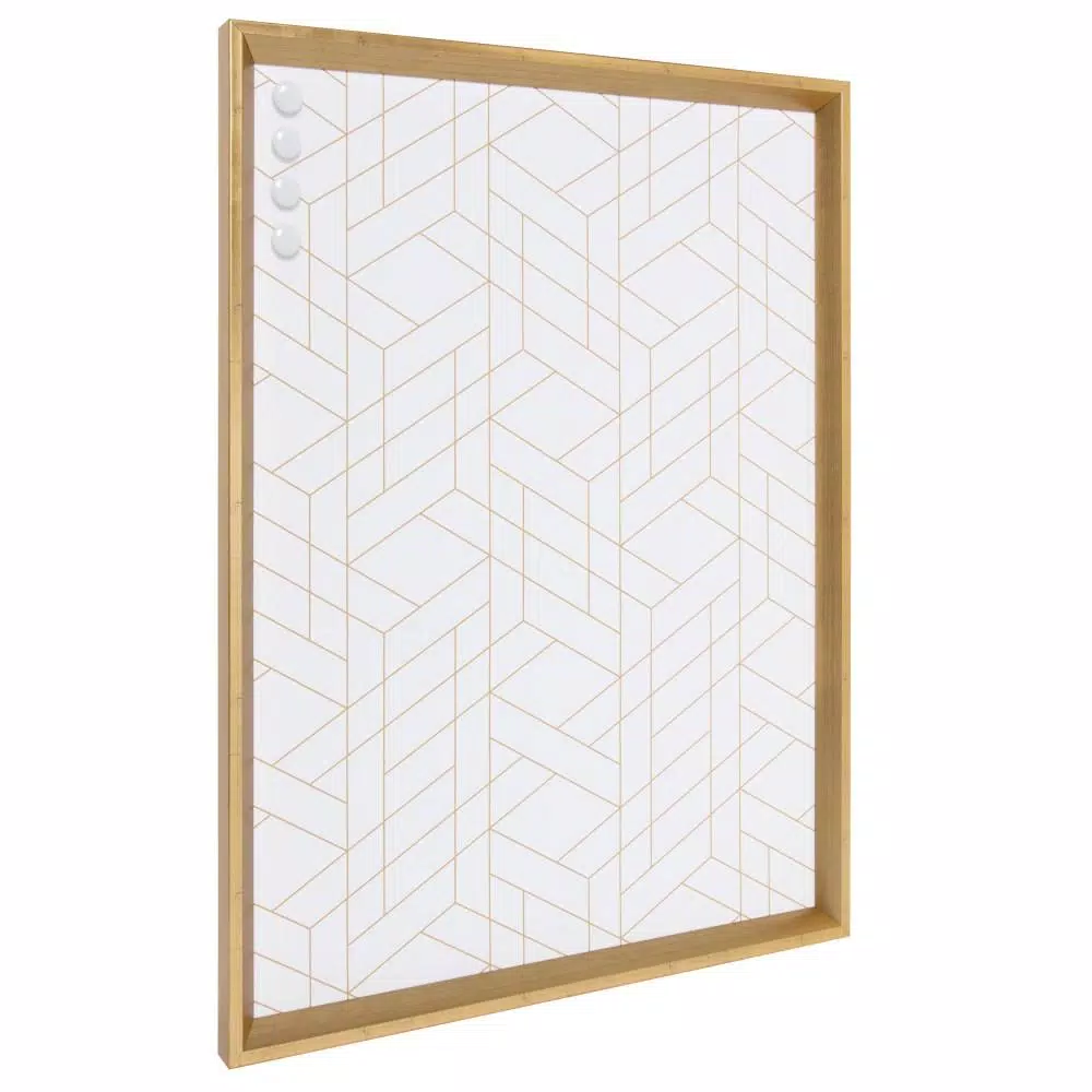 Update your walls while organizing you and your family at the same time! This wall organization board has a crisp gold and white geometric patterned magnetic stretched canvas surface to post all your important notes or display your photos. This magnetic memo board comes with metal d-ring hangers already attached and can be displayed horizontally or vertically to fit into your space! It’s ideal for use in an entryway, home office, or kitchen to coordinate and display everything you need in fantastic fashion.