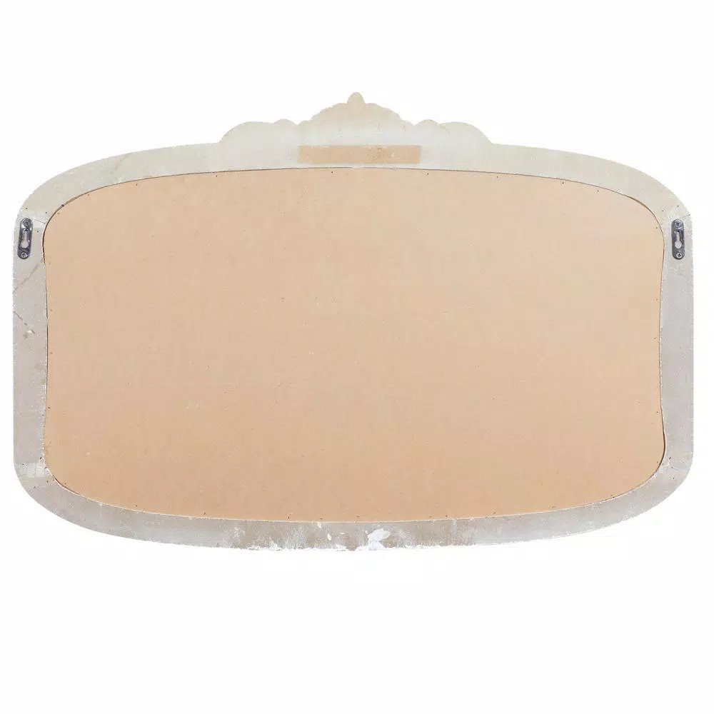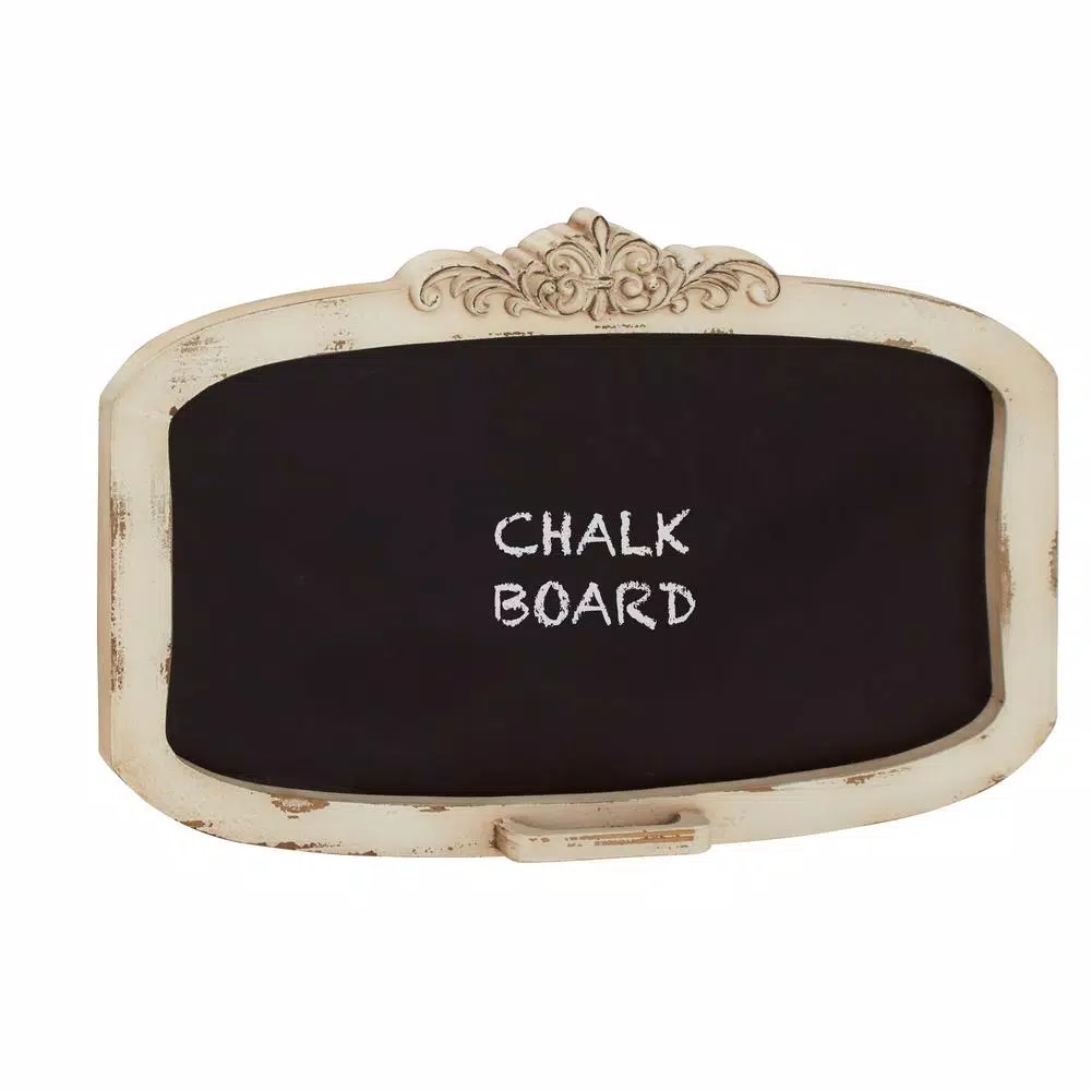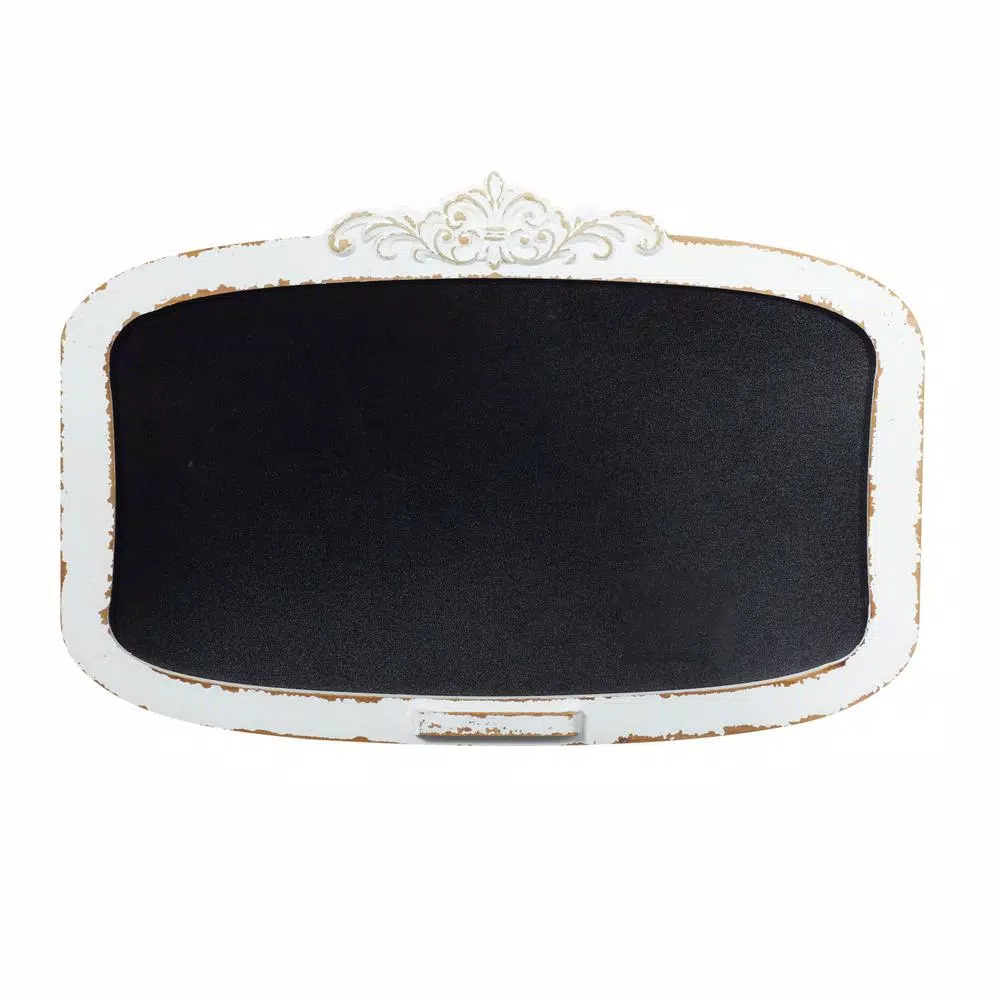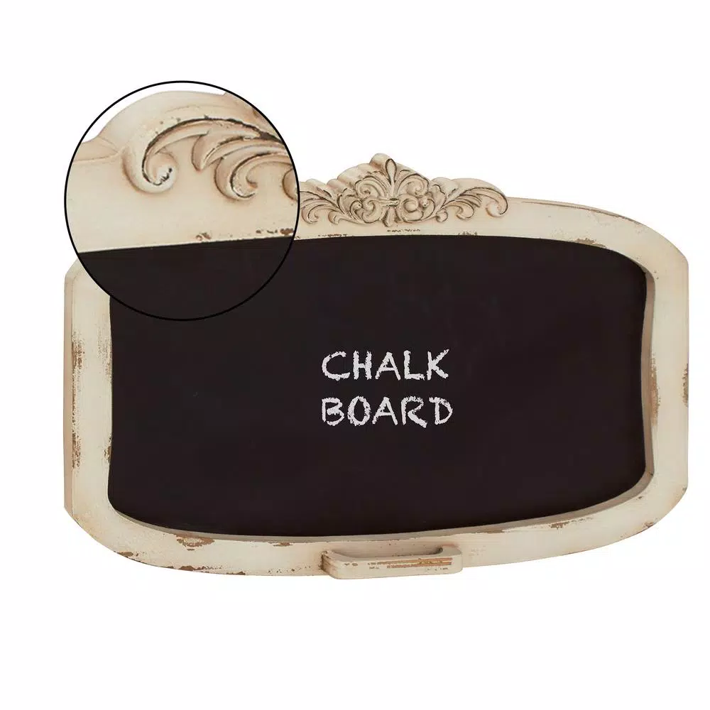 Leave notes for family members or reminders for yourself with this shabby chic wooden chalkboard. The board is framed with distressed antique ivory wood and a raised relief floral motif with arched crowns. A trinket tray is attached to the bottom of the frame.