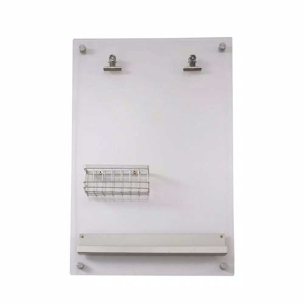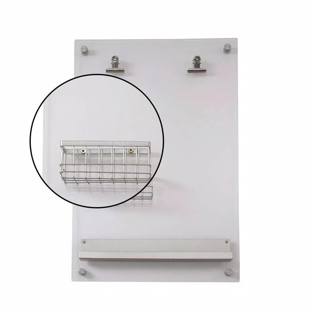 This wall-mounted memo board is the perfect decorative accent to keep you timely and organized with your tasks. It features a pocket wire basket, iron bar pen holder, and two iron paper clamps in a white and silver finish perfect for contemporary settings. This rectangular memo board features an acrylic and matte white finish that can be hung easily on your wall.