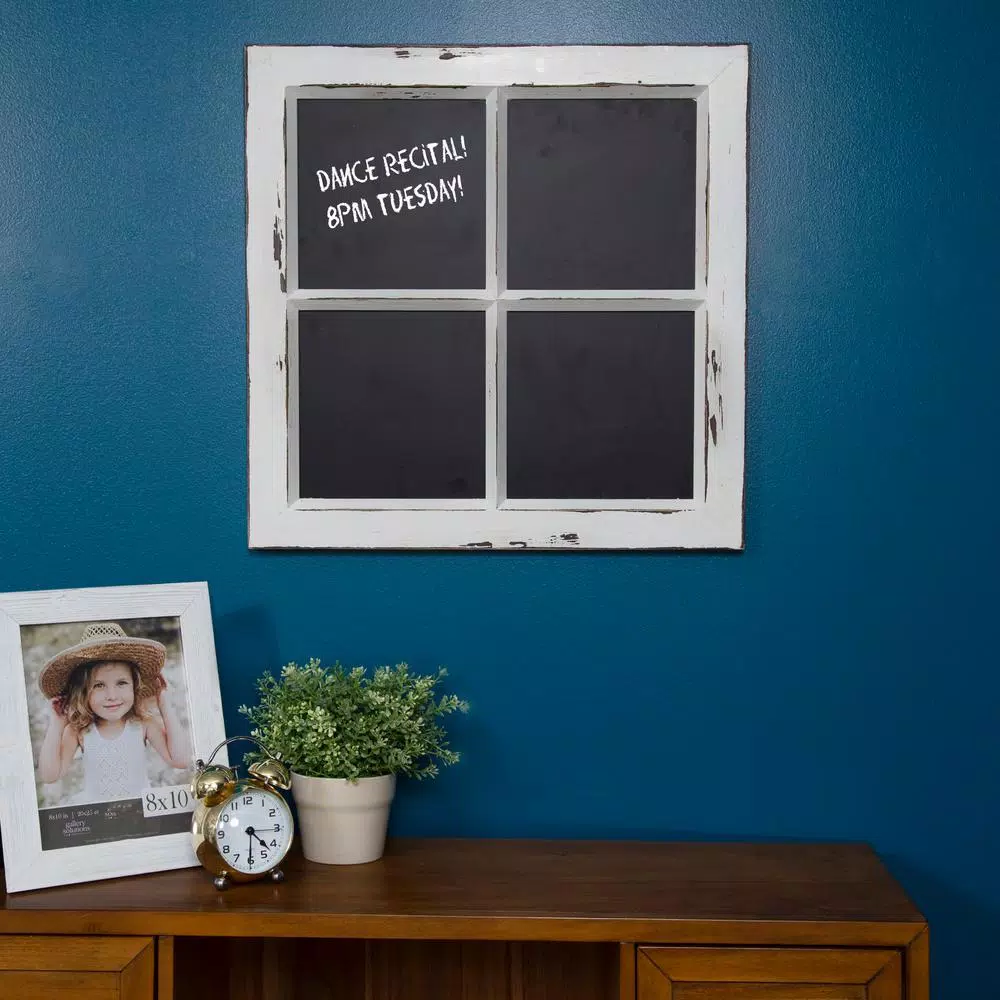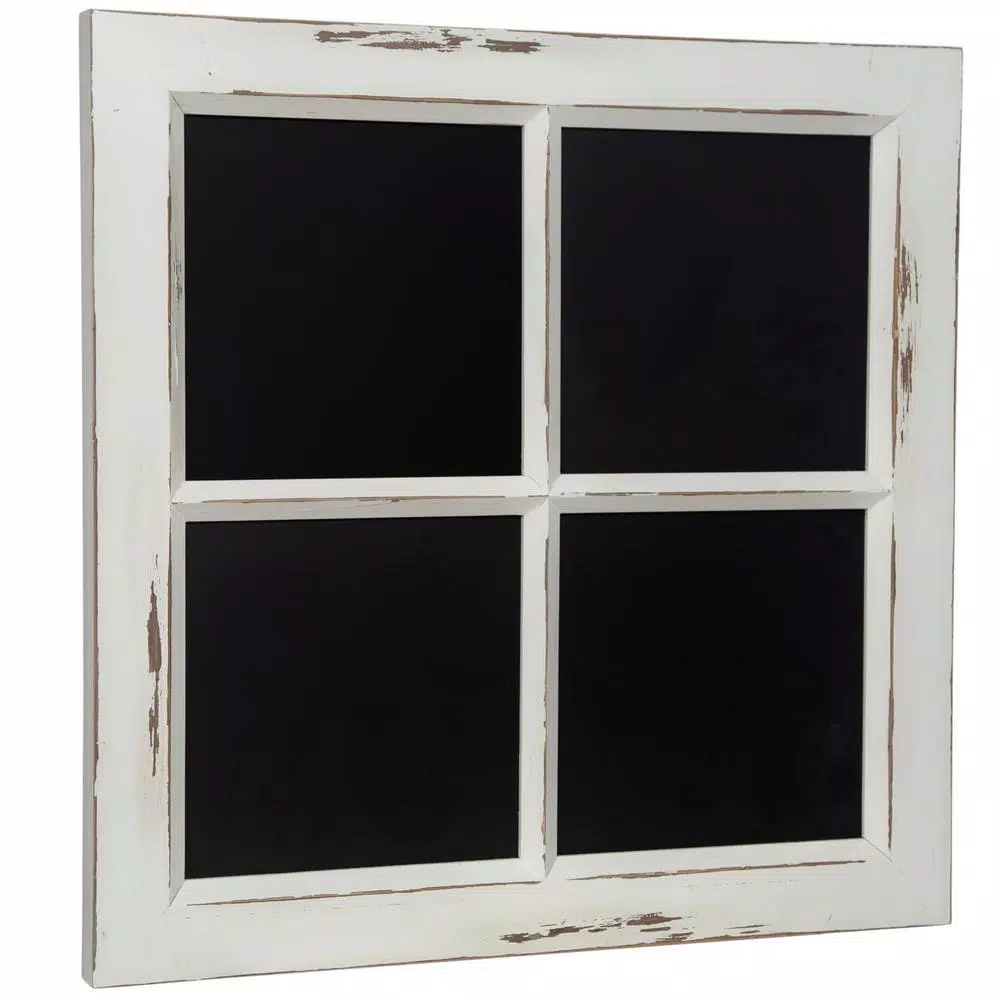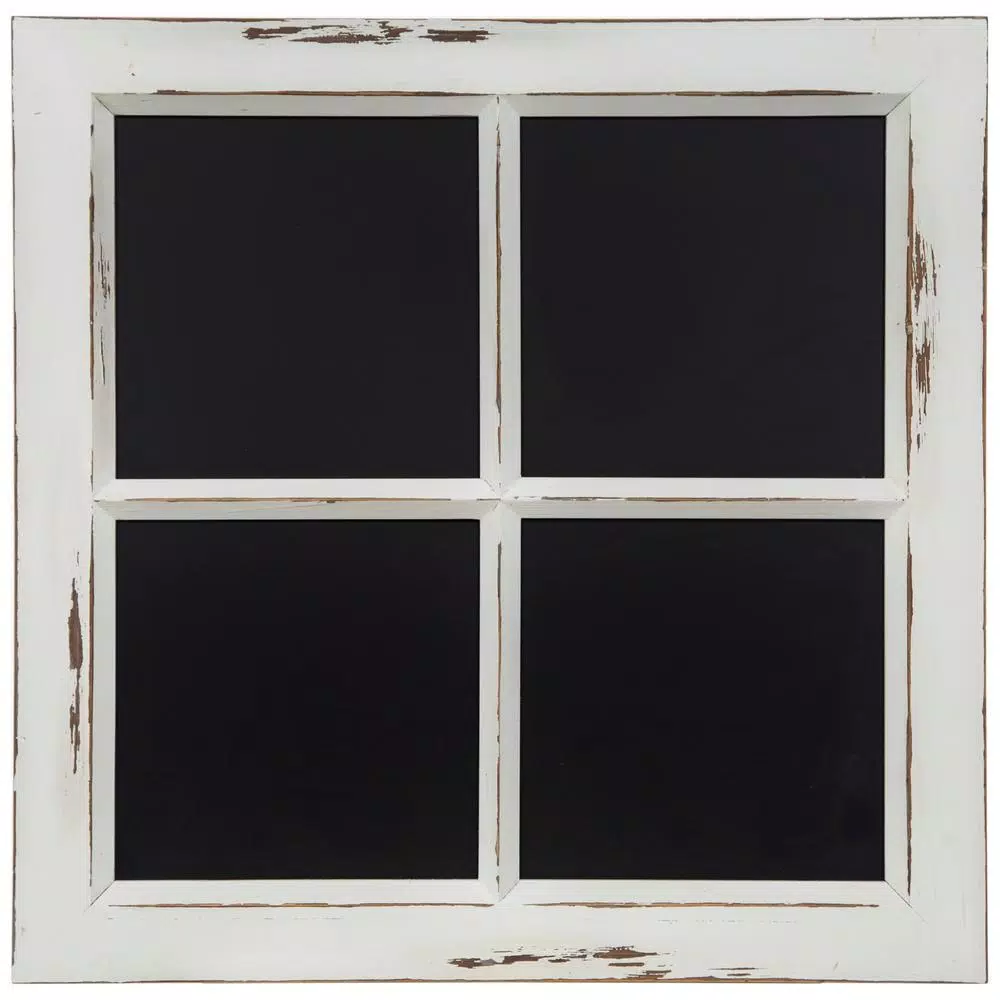 Add a touch of vintage charm and functionality to your home with the Distressed White Rustic Framed Window Pane Wall Chalkboard. This country cottage inspired wall mounted blackboard is designed to mimic antique 4 pane windows with it’s wood frame in an elegant distressed finish made to look aged and weathered. This chalkboard hangs securely to any wall surface with two sawtooth hangers on the back. Blackboard finish easily wipes clean with a damp cloth. Bring a farmhouse element to your kitchen, home office or kid’s play room. This versatile rustic decor piece is also perfect for weddings and events. Place it on a display table to invite your wedding guests with a heart warming message, paired with mason jar candles and burlap accents for a natural look.