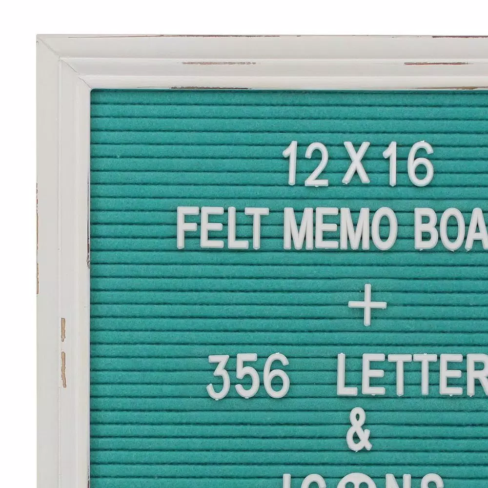 - Message board features a stylish worn white painted wood frame with decorative turquoise felt