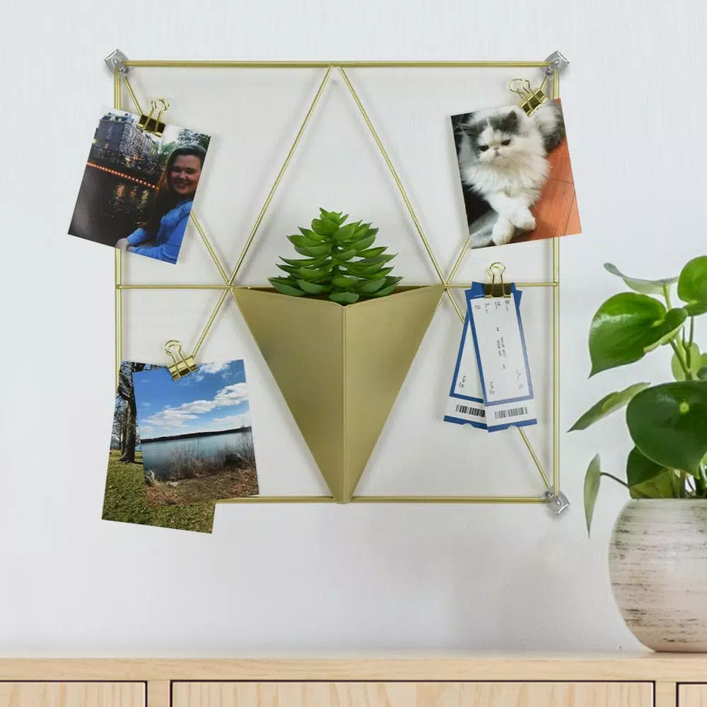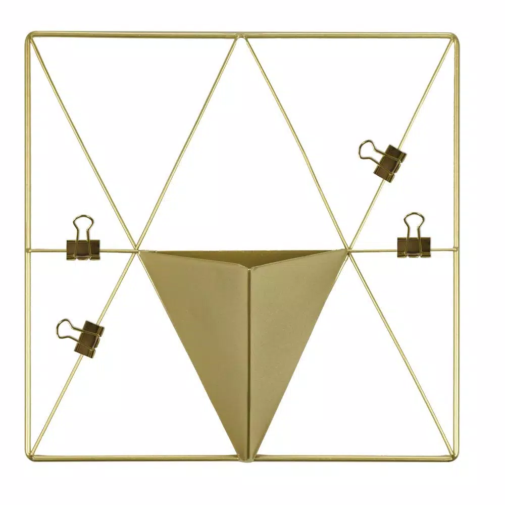 Stylish and functional, this wall organizer is complete with a useful pocket and metal clips. Its brilliant gold finish lends to its chic style. Gold triangle metal grid with pocket wall organizer contains 1-piece that measures 12.8 in. x 12.8 in.