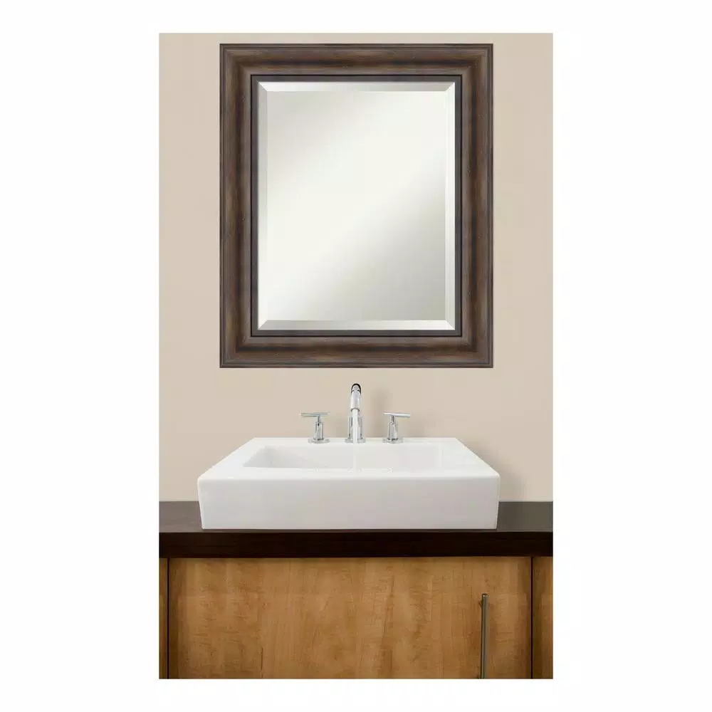 Give your bathroom the final change with this framed wall mirror sized to fit above a standard bathroom sink. The mirror features a rustic frame with a brown-washed pine woodgrain and weathered pockmark details throughout the surface. It is the perfect complement to country rustic or shabby chic decor. We know that each decoration you choose for your home, be it for your living room, foyer, kitchen, bedroom, bathroom or other space, is a reflection of your style and taste. This mirror is one of many colors and sizes that Amanti Art offers. If it is not a perfect fit, please check out our other mirrors on Homedepot.com. Choose from casual, traditional, modern, contemporary, country rustic or shabby chic styles.