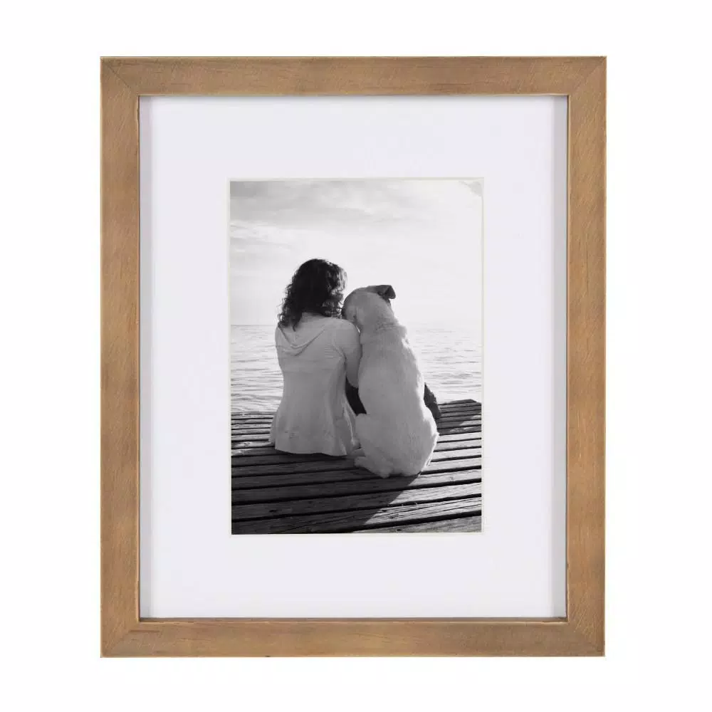 Take it from your favorite home-decor magazine – a cluster of smartly displayed photos all presented in stylish wooden frames is the trend that is becoming a classic. What was once a cluttered arrangement gathering dust becomes the main focal point of any room. Capture your cherished photos of family, friends and special occasions with the DesignOvation Gallery Wood Frame Set. The traditional look of this rustic finish frame set will add a modern feel. With this frame collection, you can personalize your display of photos to suit your space and style using any customizable layout that you design. The frames can hang portrait or landscape style and can be arranged on a tabletop with the ready-to-use easel on the back or mounted securely on a wall with the metal sawtooth wall hangers that come attached to the back. The white mat creates an additional decoration and brings the viewers focus on what matters – your photos. It’s a simple way to create drama or fun in your home or office. The outer frame dimensions are 9 in. x 11 in. Each frame holds one 5 in. x 7 in. photo with the included mat or an 8 in. x 10 in. photo without the mat.