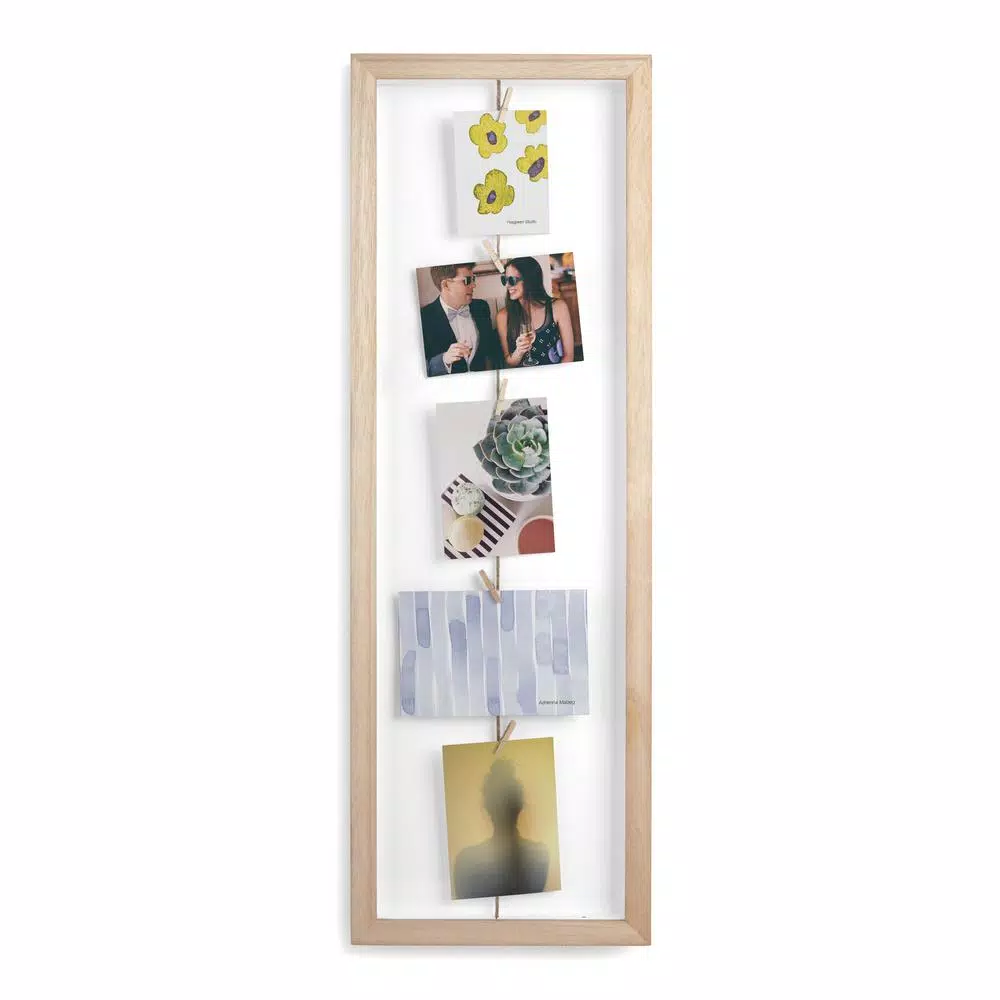 Keep things flexible and hang your photos vertically or horizontally depending on how much space is on your wall. Molded wall frame with clothesline and 7-wooden clips to hold photos or keepsakes. Display photos and mementos in this unique frame.