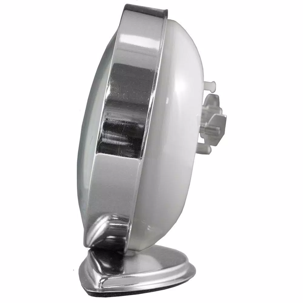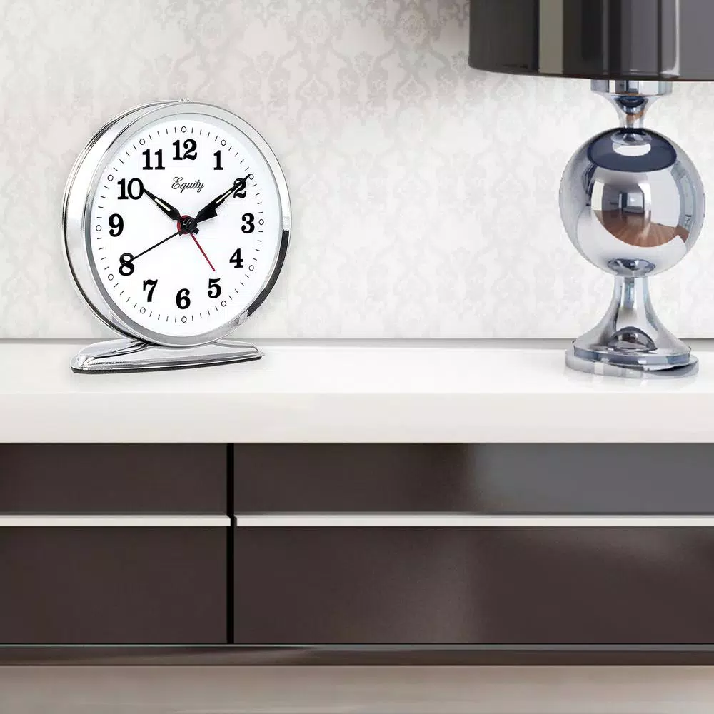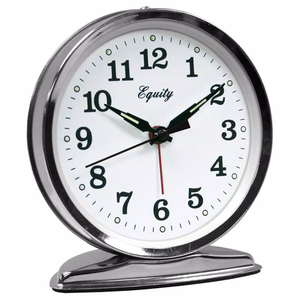 No batteries required with the key-wound chrome frame bell alarm clock. Features luminous hands and hour dots on a white dial. A protective base pad prevents any scratching.