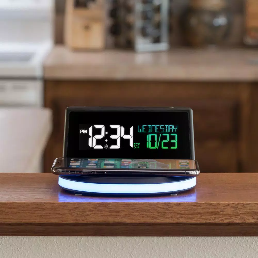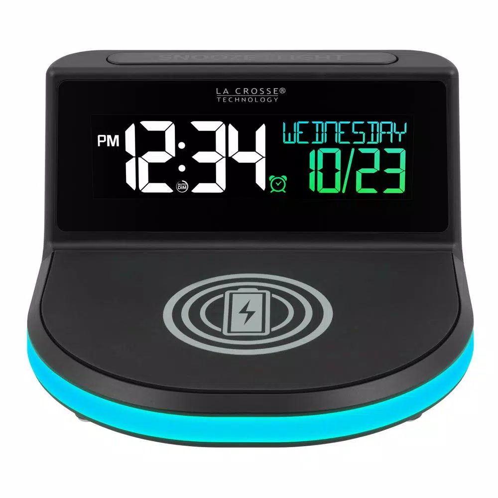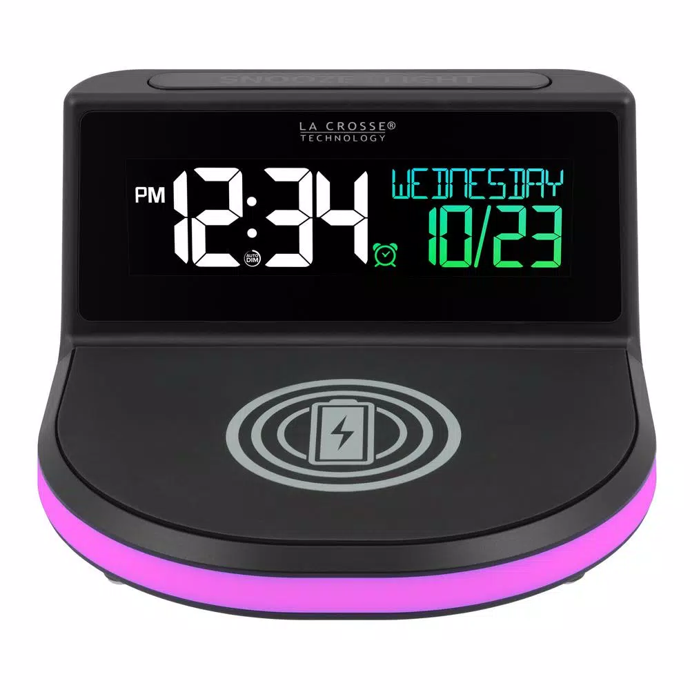 Start and end your day with La Crosse Technology’s Wireless Charging Alarm Clock with Glow Light. Choose from seven unique and welcoming colors ranging from soothing to energizing to set the right mood. This clock can ensure that you wake on time. Ascending alarm option gradually increases intensity to ease you into a wakeful state. With the wireless charger you’ll awake with your phone fully charged as well. Current time displays in large easy to read numbers. Choose to also display a combination of weekday, calendar month and date, and indoor temperature. Adjust brightness automatically or schedule for optimal display. Also features a USB charging port.