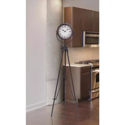 This tripod floor clock stands 57 inches high and was inspired by the lighting used in the movie industry. The core timepiece is framed in black tranished metal, with a mottled gray and white clock face and black Roman numerals. The supporting base is a camera-style tripod with exposed bolts, decorative crank and adjustable brace.