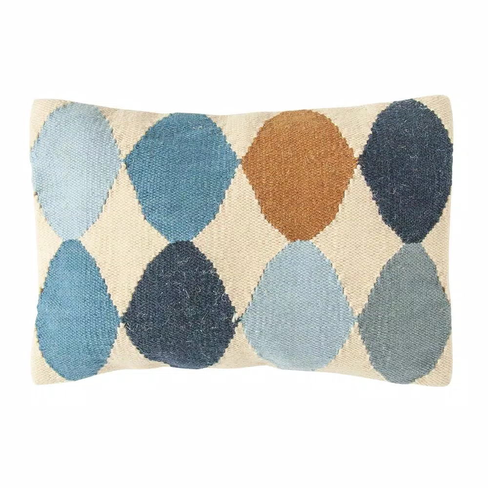 Multiple shades of blue outnumber the single brown accent on this pillow. That little touch of brown makes it possible to create a stunning setting by adding a brown throw behind it. On one of the nearby tables, add a collection of candles in the same shades of blue as on the pillow and the eyes will flow from pillow to throw to candles in one smooth motion.