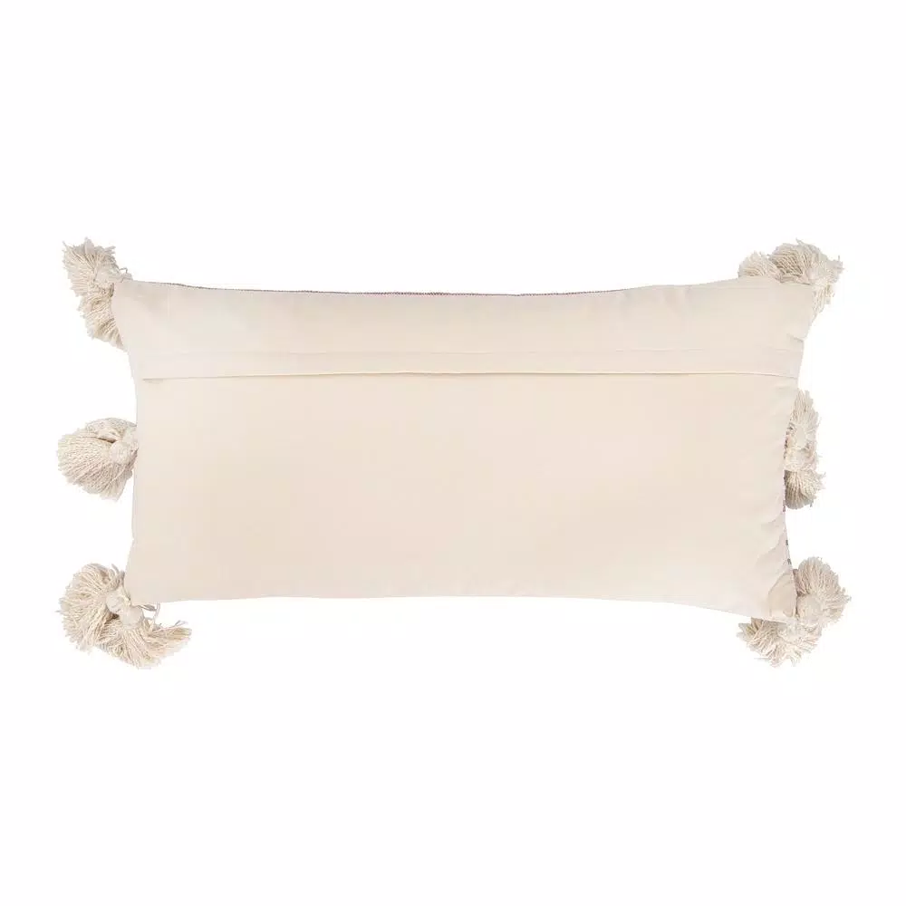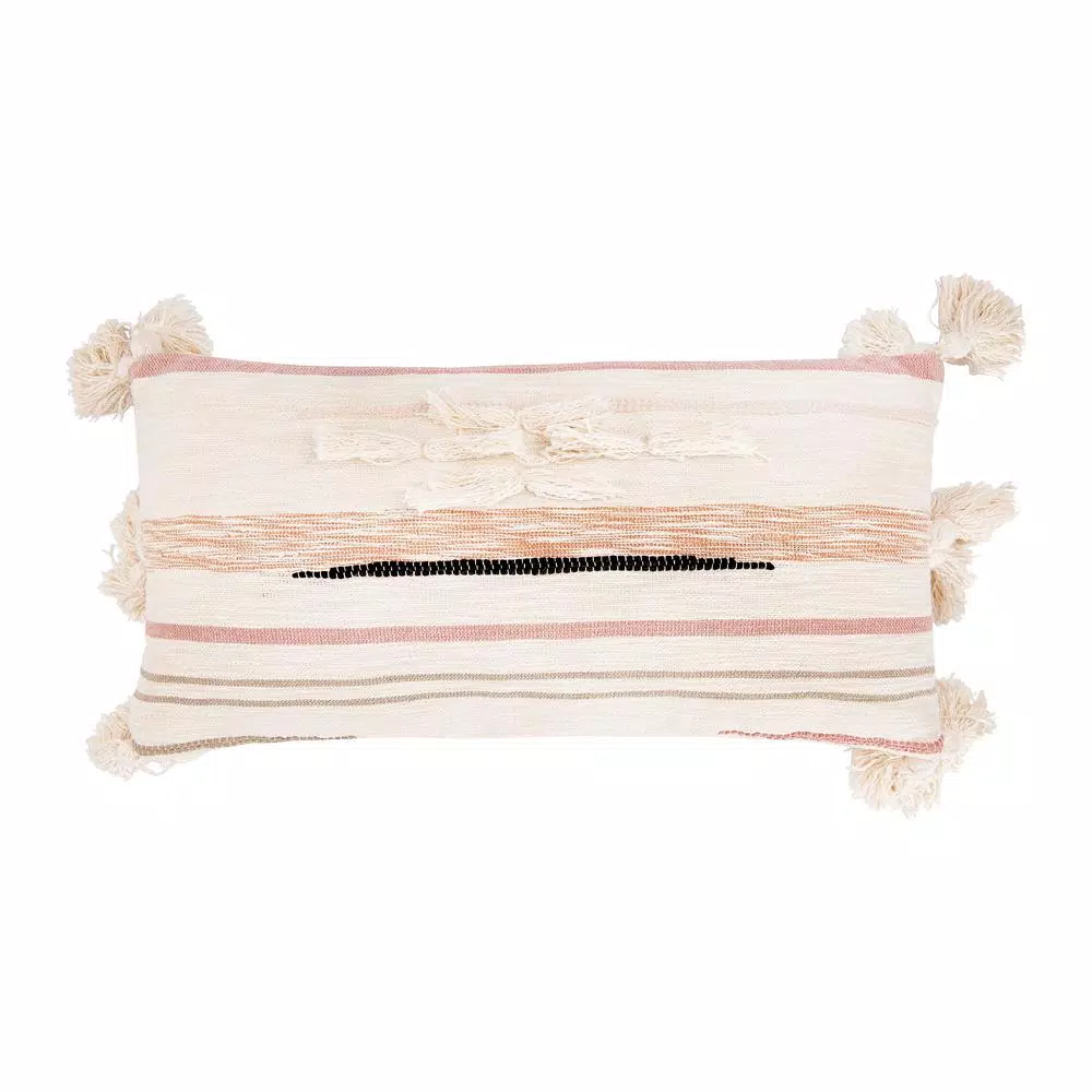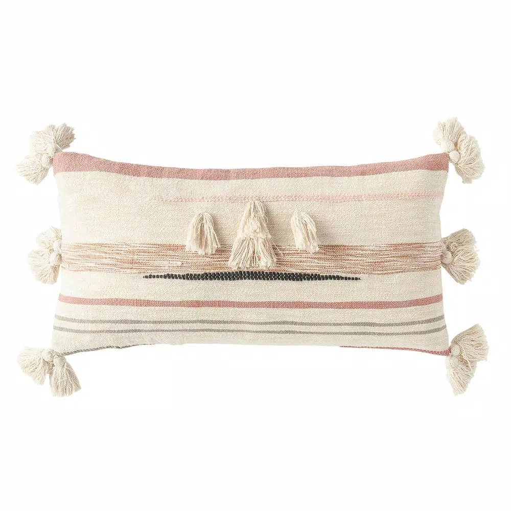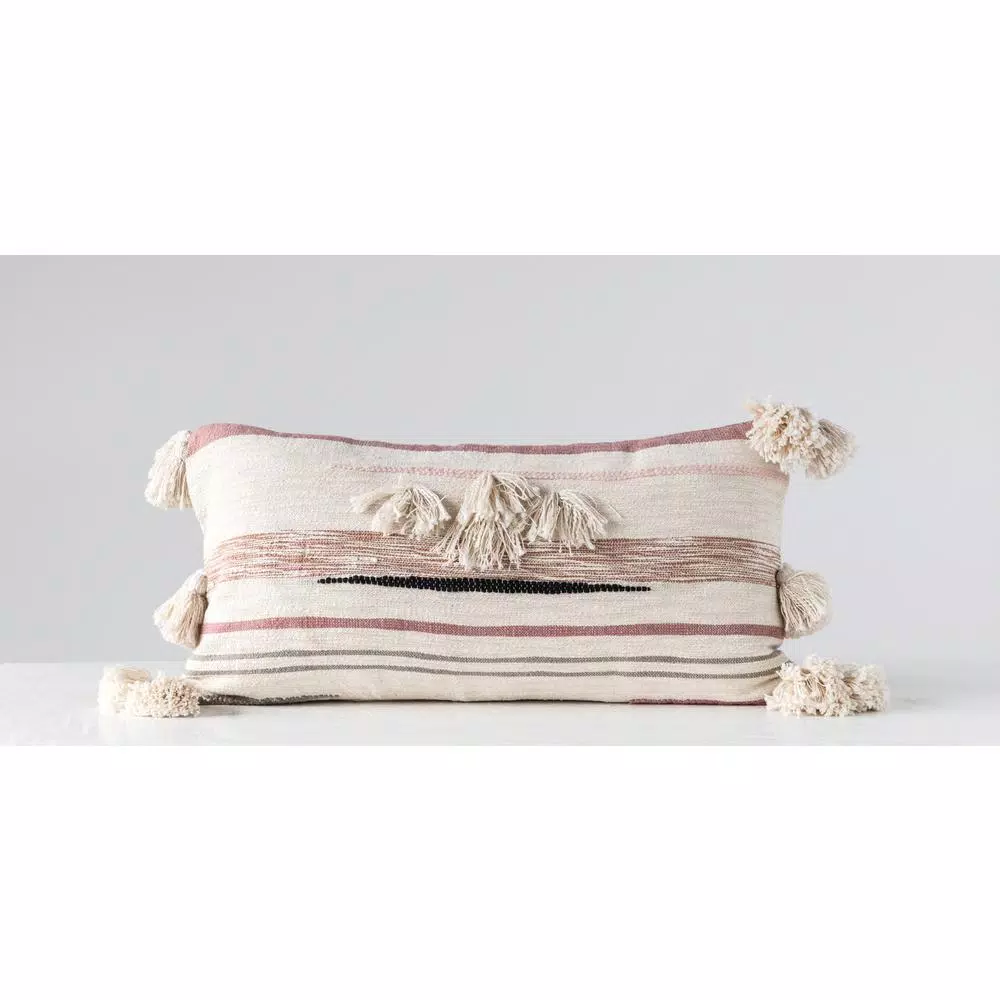 Stripes of pink, brown and black are the background to fun, cream color tassels. These tassels grab the attention by planting themselves front and center. Adorable plush tassels with ball tops complement the sides of the pillows in threes. Add definition to a solid background of pink by placing this decorative pillow in the center with a collection of solid black and brown pillows on either side.