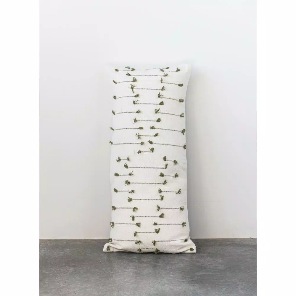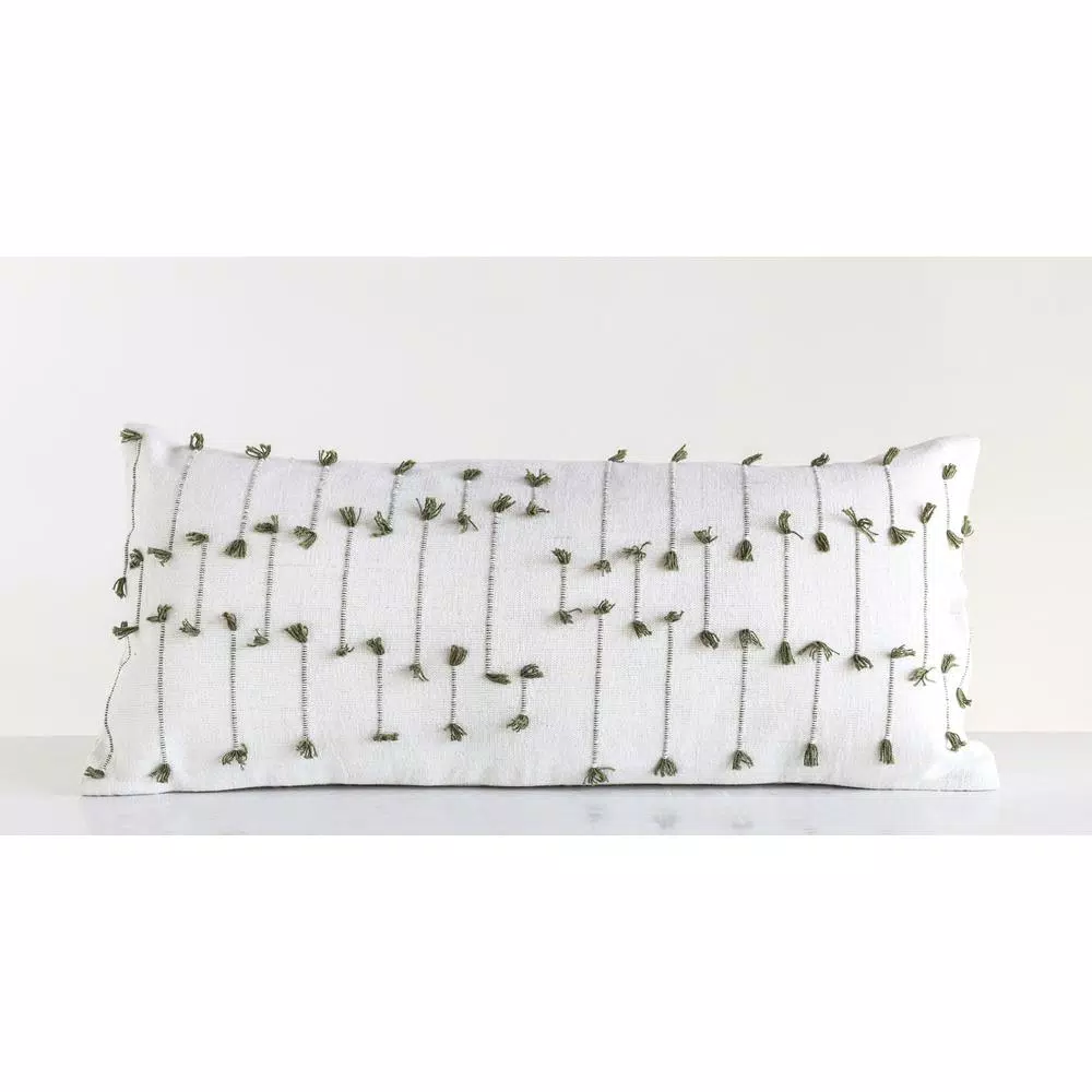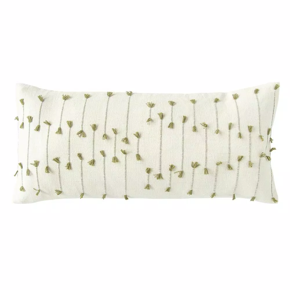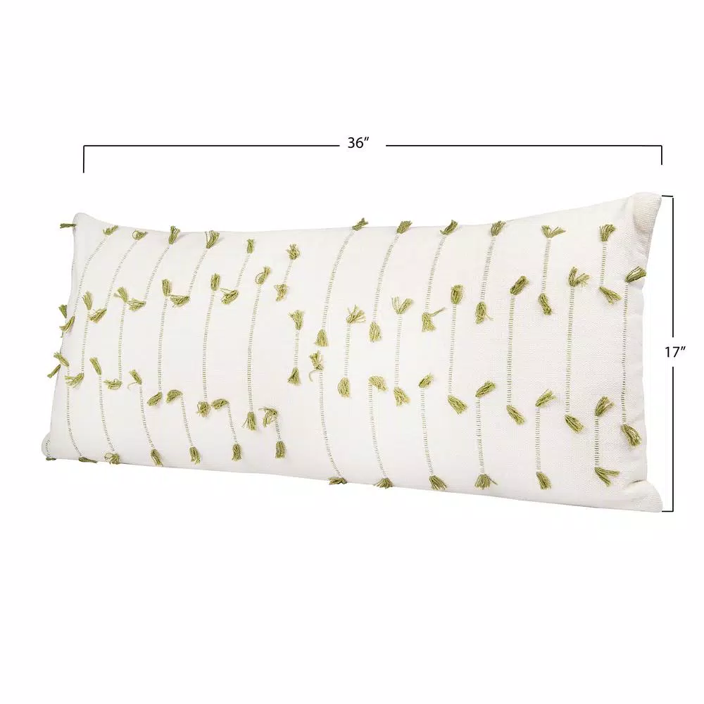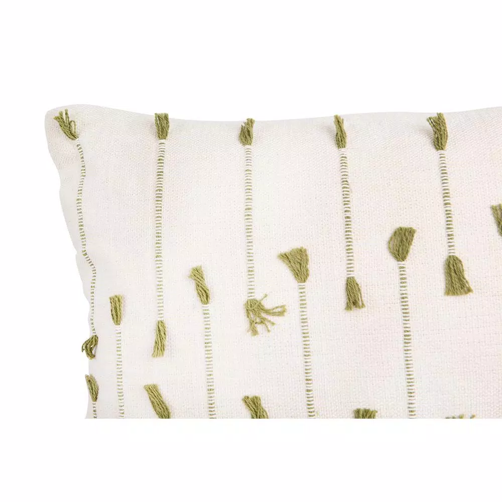 Delicate mini green tassels decorate this pillow and are connected with various lengths of stripes. Perfect for bringing a friendly atmosphere along with it. The color green will also add a touch of the outdoors to any living space as well as adding elegance and charm.