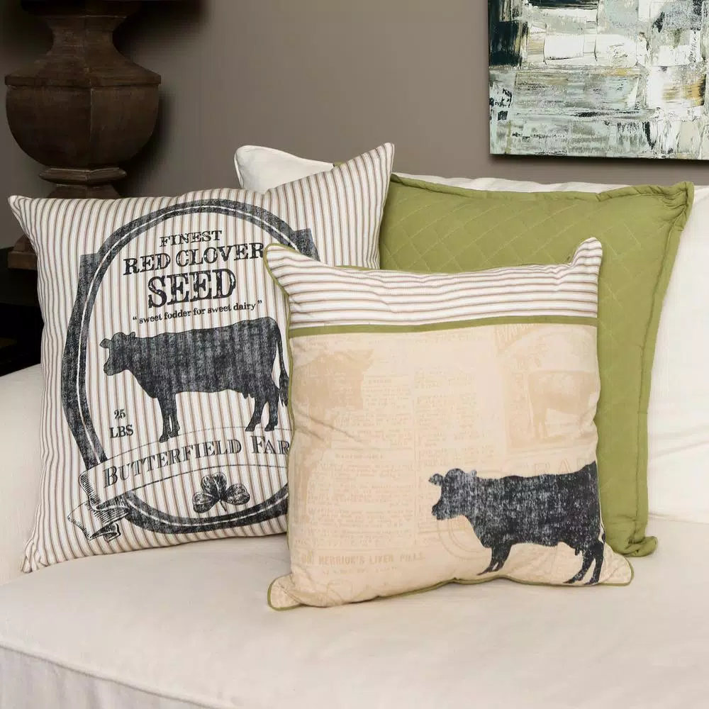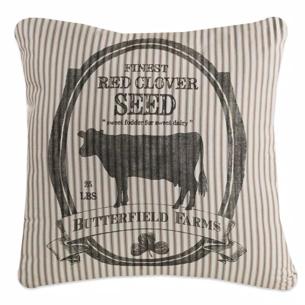 Add a little rustic charm to your farmhouse decor with our Butterfield pillow. Inspired by vintage grain sacks used to store seeds, this pillow will add comfort to any room. The screen-printed Butterfield Farms logo declares sweet fodder for sweet dairy and appears against a ticking stripe cover. Pillow cover only. Machine wash.