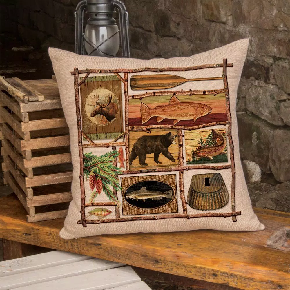 The Lodge Hollow pillow captures the spirit of nature in a rustic collage. An eye-catching array of wildlife, fish, lures, and rustic foliage merge with a rich, lodge inspired color palette to naturally complement your cabin decor. Expertly printed on soft, woven polyester for easy care.