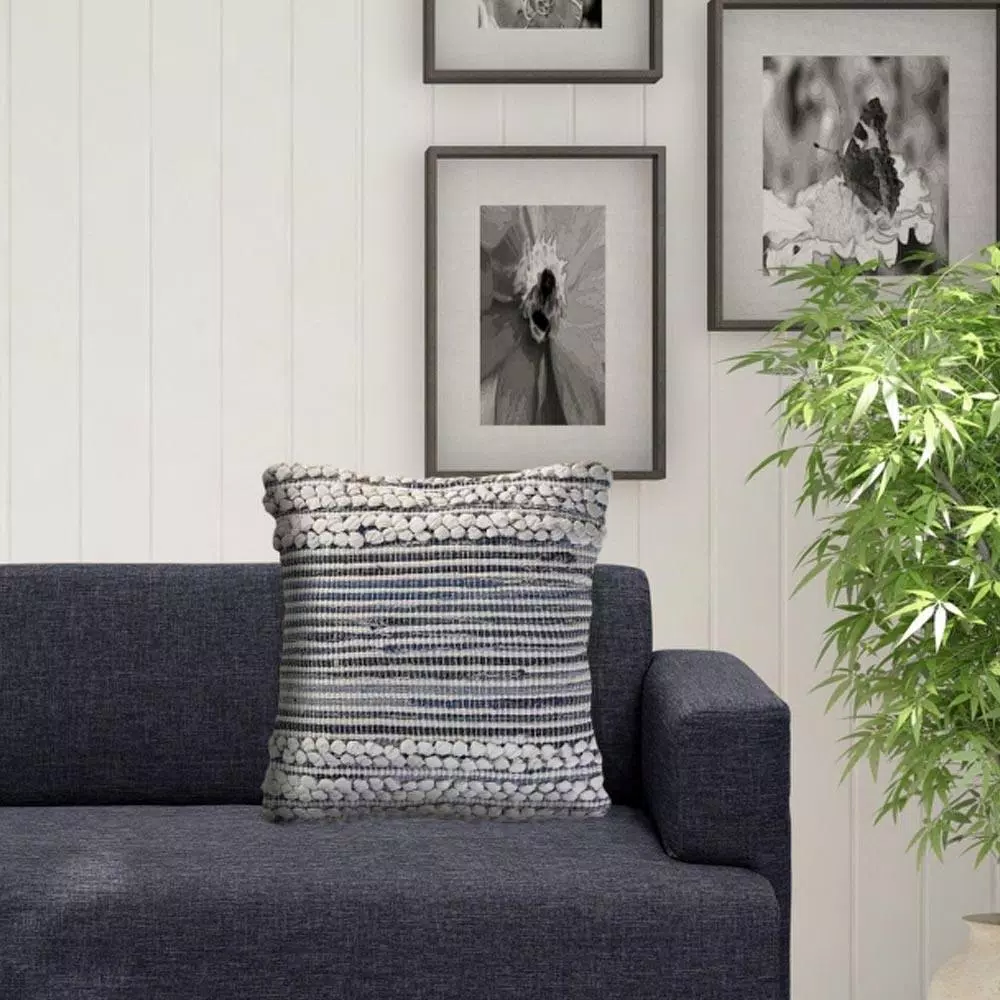 Designed to thrill, our pillow collection will add intricate mastery and eye pleasing designs to any room. Combine delicately stitched geometric patterns with soft to the touch textures to make an eye-catching centerpiece for your pillow collection. With bold blue and navy alongside crisp ivory, this piece can be placed within a variety of different style environments. Hand-made with the customer in mind, there is no compromise of comfort and style with the pillow line we create.