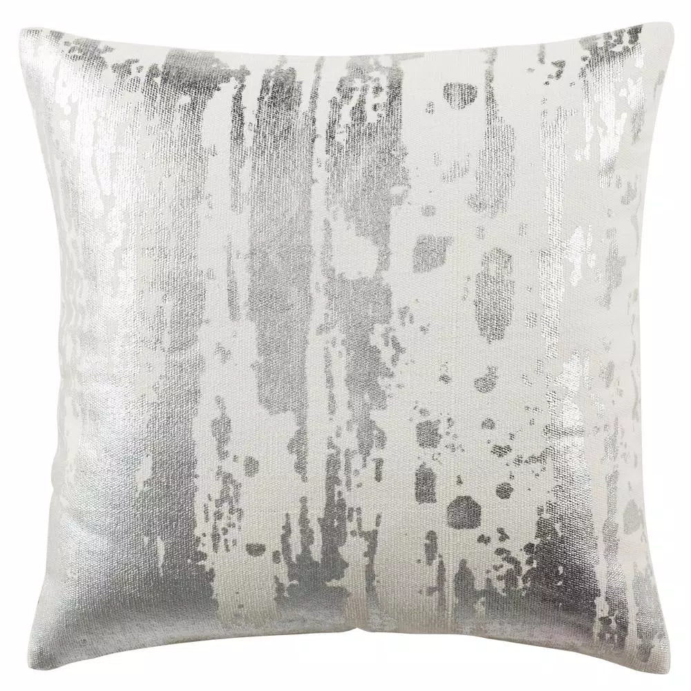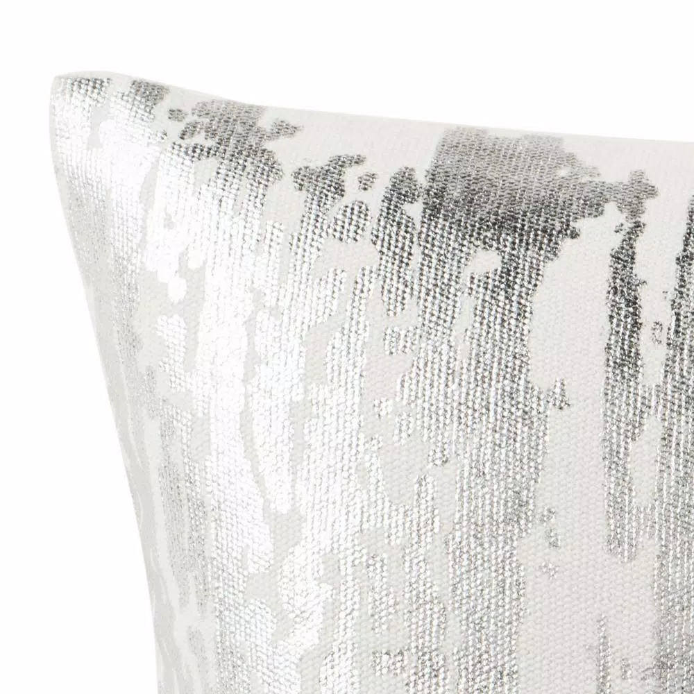 Living room and bedroom decor is treated to the sparkling splash of color and texture with the Metallic Splatter Accent Pillow. Made of pure soft cotton and colored in white and silver for a striking character aspect to the loveseat, or solid colored upholstered headboard. Makes a comfortable headrest with a downy-soft, feather filled insert and hidden zipper on the back cover for easy-access care and cleaning.