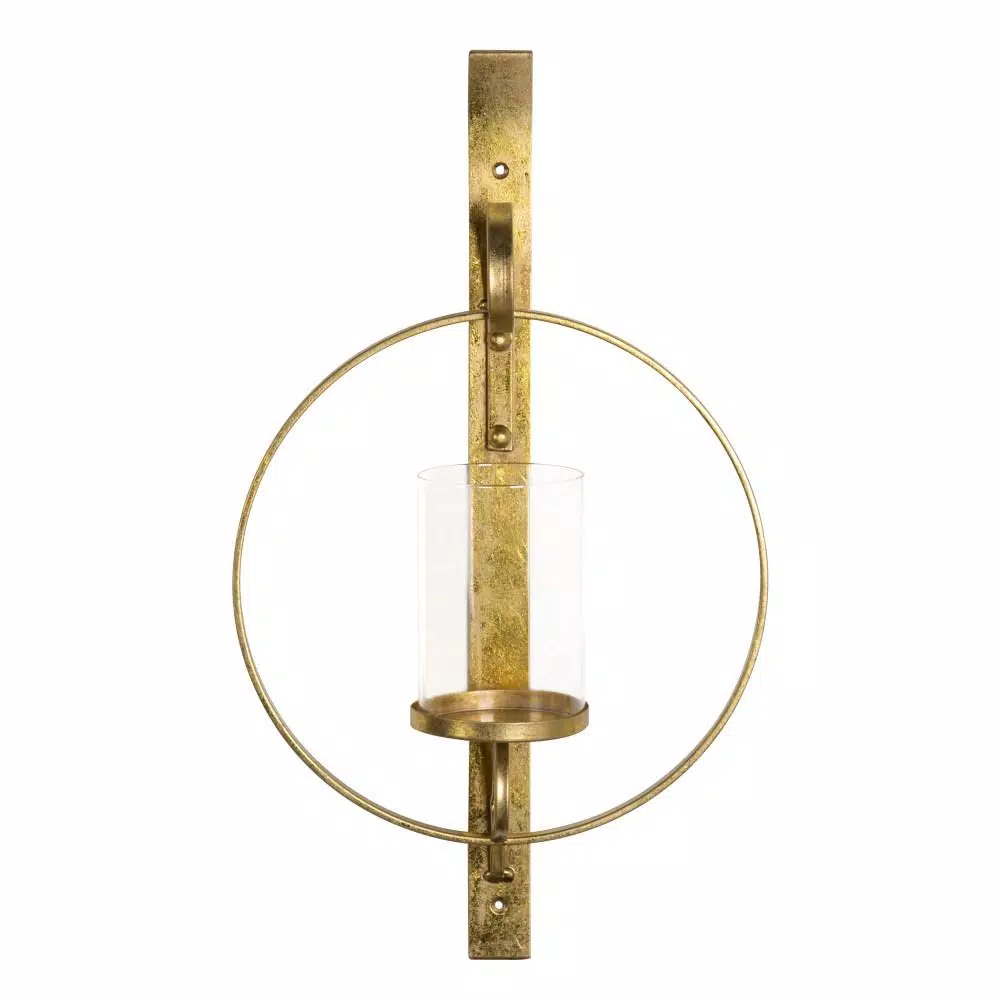 Bring a glamorous accent and warmth into your home with this lovely round metal wall candle holder sconce. This metal sconce measures 21.75 inches high and the metal post that attaches to the wall is 1.5 inches wide. The metal candle holder base is 4 inches wide and is recommended for use with a 3 or 3.5 inch base pillar candle. Included is a glass pillar 6 inches high. The decorative metal circle has a diameter of 12.5 inches. Use two nails or bolts through the pre-drilled holes to fasten securely to the wall (not included). This glamorous metal sconce is truly a gorgeous statement piece perfect for your home!