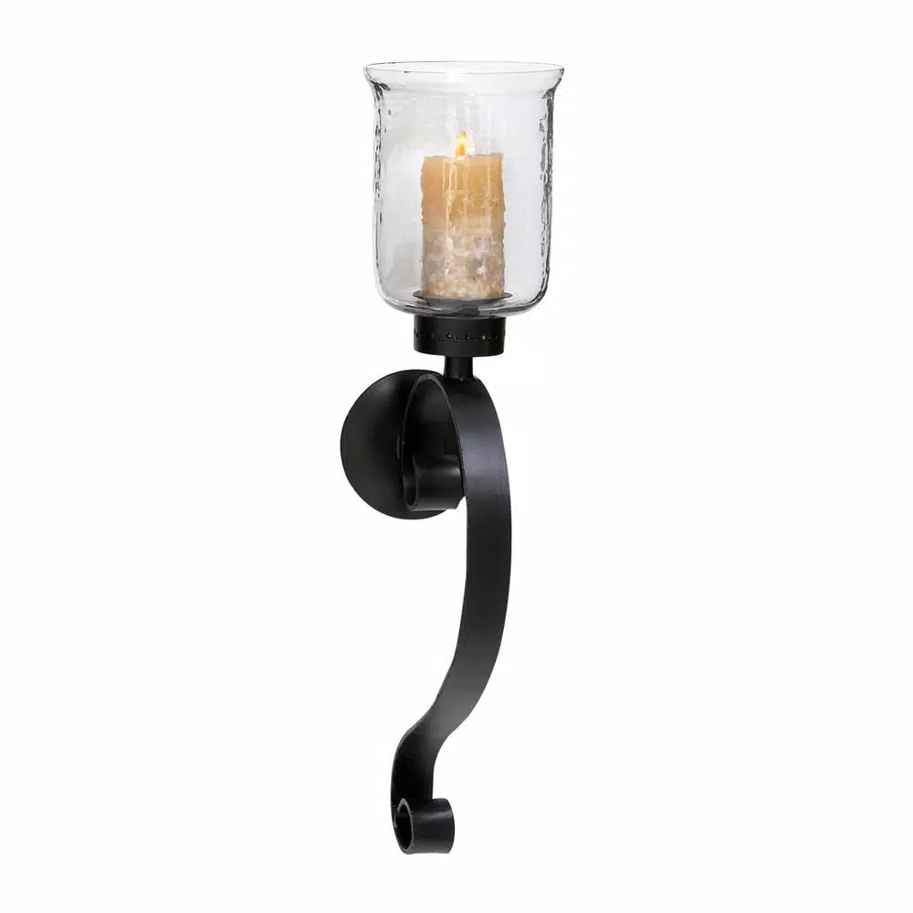 This wall sconce features a new traditional design with its classic flared-top hurricane candle holder made of clear glass. It is made with a round iron pedestal attached to a black iron scrollwork that brings a dramatic touch to the sconce. This decorative piece is sure to add a classic feel to your home interior.