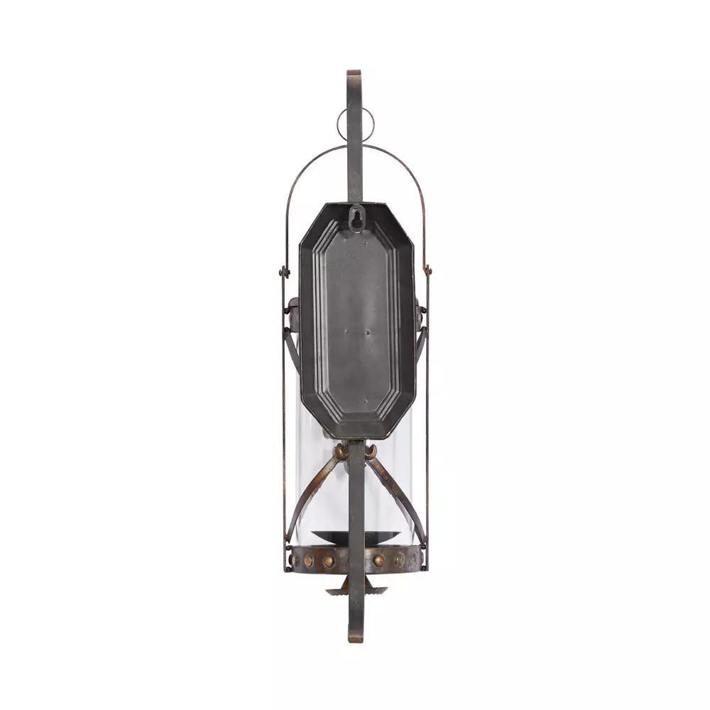 This candle sconce features an old-world-inspired design with its elegant fleur-de-lis motif and riveted top and bottom glass details. It has a sturdy ring holder and a beveled iron wall fixture that easily mounts on any wall surface. The tarnished bronze finish of this candle sconce is sure to add a dramatic and elegant touch to hallways and entrances.