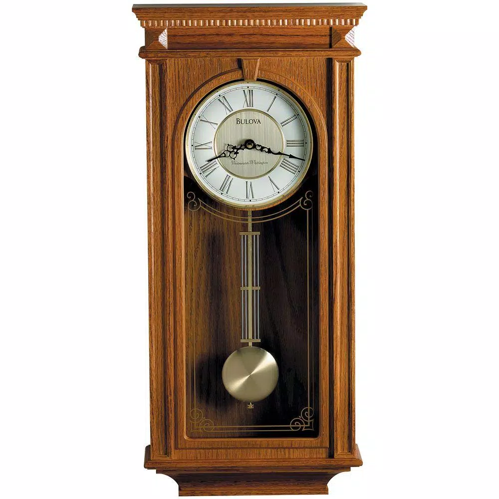 The Manor court pendulum chime wall clock is a magnificent wall clock with exceptional craftsmanship. The oak case and golden oak finish make this a very distinctive clock for any room decor. A 2-tone metal dial adds to the upscale appearance of this clock.