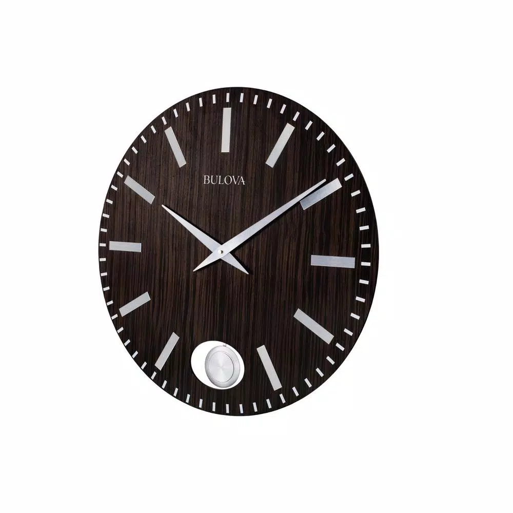 The Manhattan 24 in. wall clock by Bulova is a contemporary slim-profile design with a zebra-wood finished case. The dial has brushed silver-tone hour markers and leaf hands. The Peek-a-boo slow-swing pendulum at 6 o’clock has removable silver-tone disk for personalization. The quartz movement adds an extra layer of quality to this marvelous wall clock. Requires (2) AA batteries, not included.