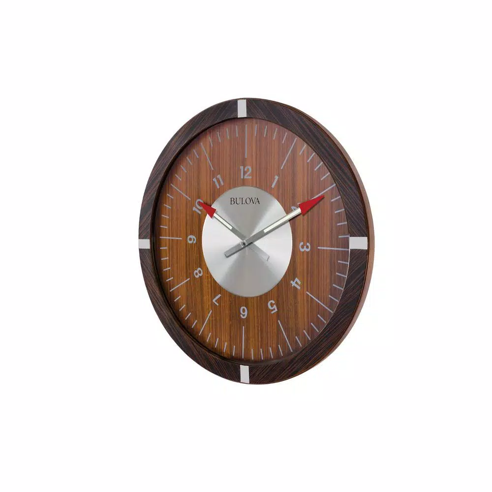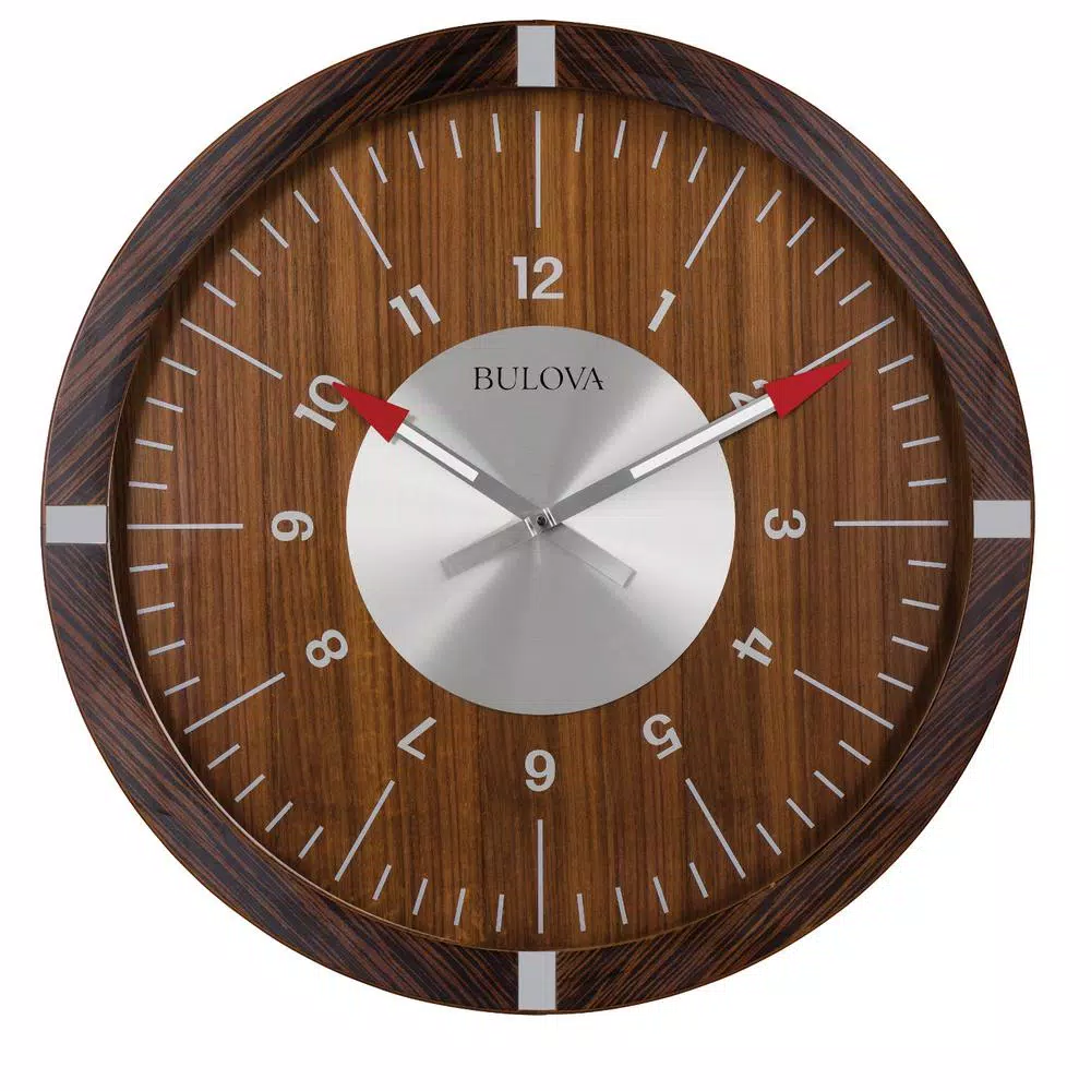 The Aerojet oversized 30 in. wall clock has a sleek industrial design. The Zebrawood veneer outer case with satin lacquer finish enhances the natural grain. It also features satin silver-tone inserts at quarter hours. A complementary walnut veneer inner dial with silver-tone Arabic numerals and markers add style and form to this marvelous clock. The unique red-tipped hands are inspired by Bulovas Aerojet watch. Requires (1) AA battery, not included.