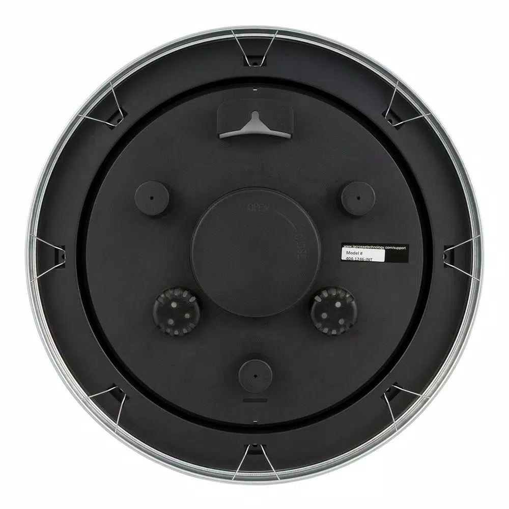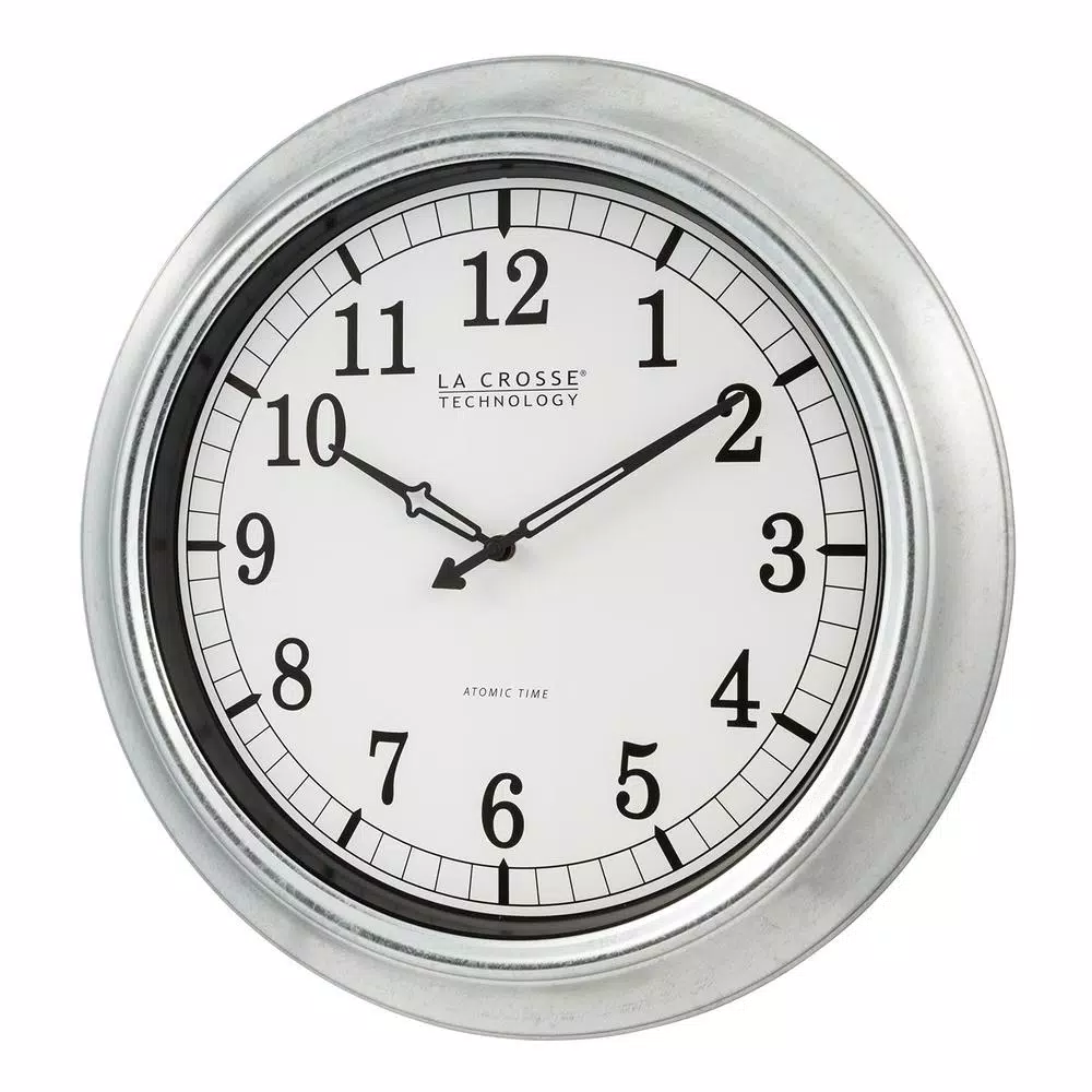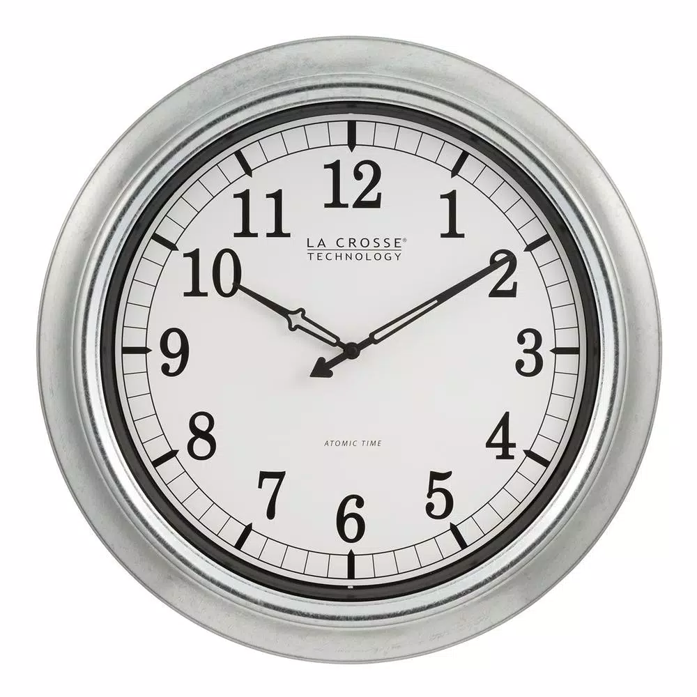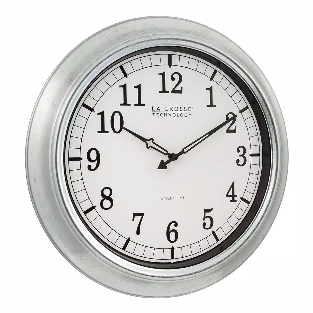 Strong & durable silver 18 in. clock decorates your wall beautifully. A weather resistant galvanized metal frame, it can hang in an outdoor patio or lanai. Or enjoy inside your home with your modern decor. Automatically adjusts time to 4 US time zones and will reset during Daylight savings time for you. Glass lens and battery (not included) operated.