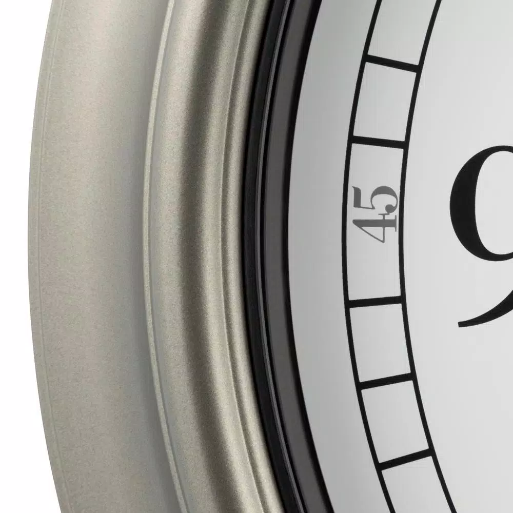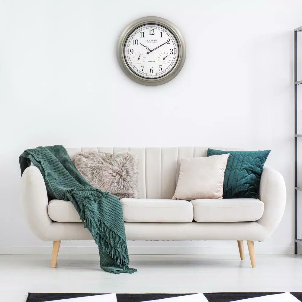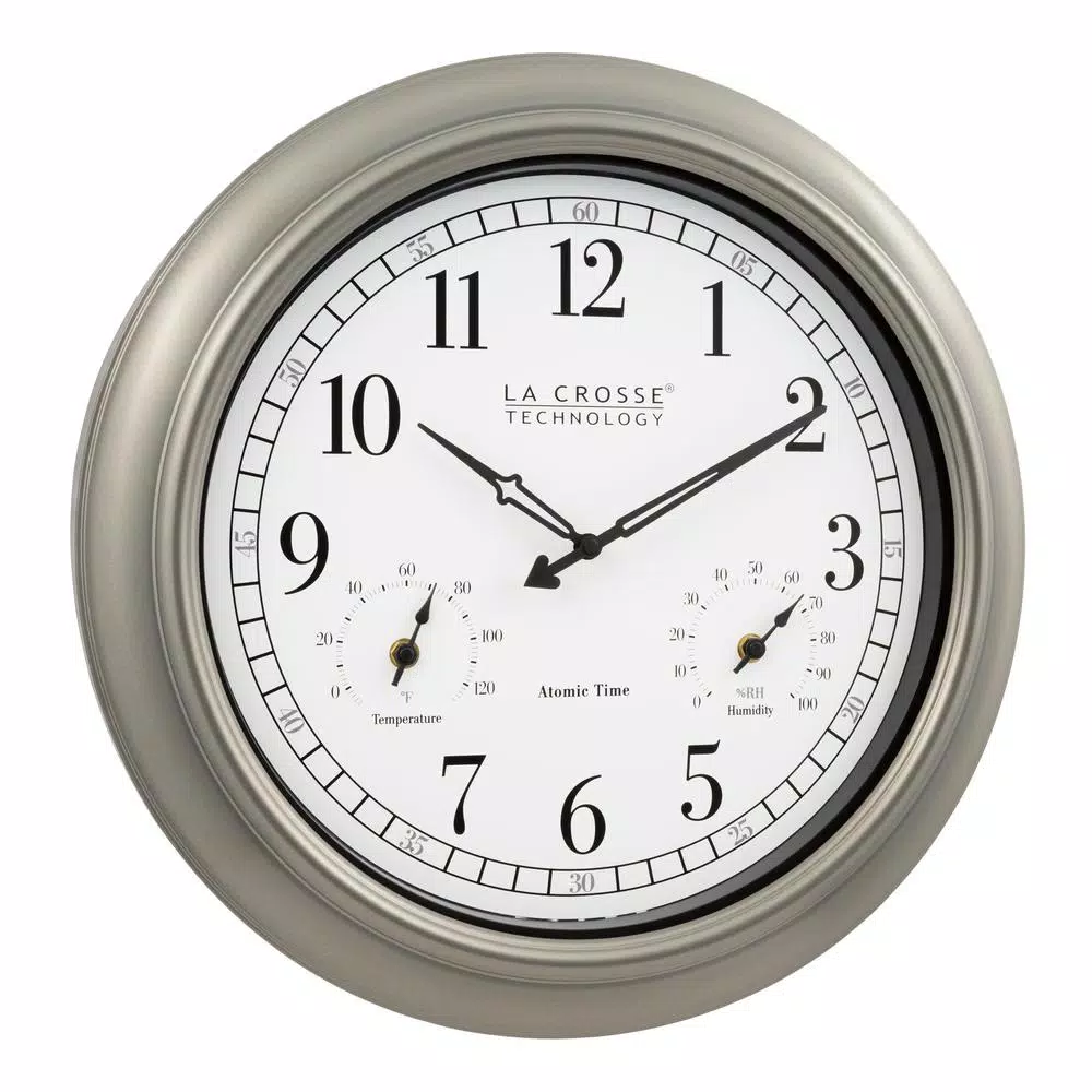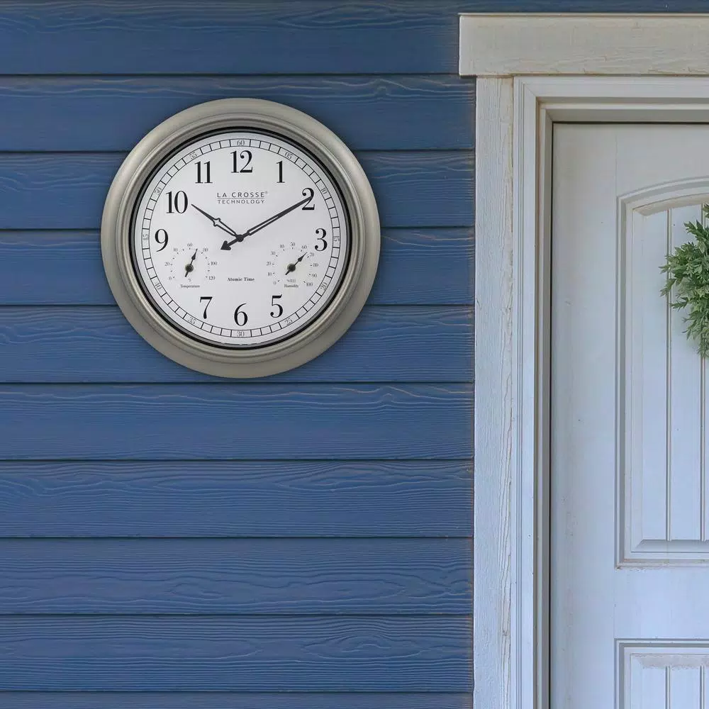 Keep track of time with the utmost precision while barbecuing on the patio, working in the garden, or splashing in the pool with this 18-inch outdoor atomic wall clock from La Crosse Technology. Radio-controlled to automatically set to the National atomic clock in Colorado, and adjusts daily for continued accuracy. Additionally, the clock automatically corrects for daylight savings time. Equipped with a two small analog gauges, it also displays the ambient temperature and humidity to let you know of dry or wet conditions. The hygrometer gauge measures from 1 to 99 percent relative humidity, while the temperature gauge gives readings for temperatures from 0 to 120 degrees Fahrenheit. Surrounded by a sleek pewter-painted plastic frame, the clock face features black 1 1/2 inch high numbers for easy visibility. Elegant, black metal hands tick off the hours and minutes. On the backside of the clock, the user selects the appropriate US time zone; the clock accommodates Eastern, Central, Mountain, and Pacific times. A manual reset button is provided. To ensure accurate readings, hang the clock in a dry area out of direct sunlight. This clock requires the separate purchase of one AA battery for operation with an optional compartment (2 additional) to extend clock battery life. A one-year limited warranty covers this item. The clock measures 18 inches wide by 2-1/2 inches deep by 18 inches high.