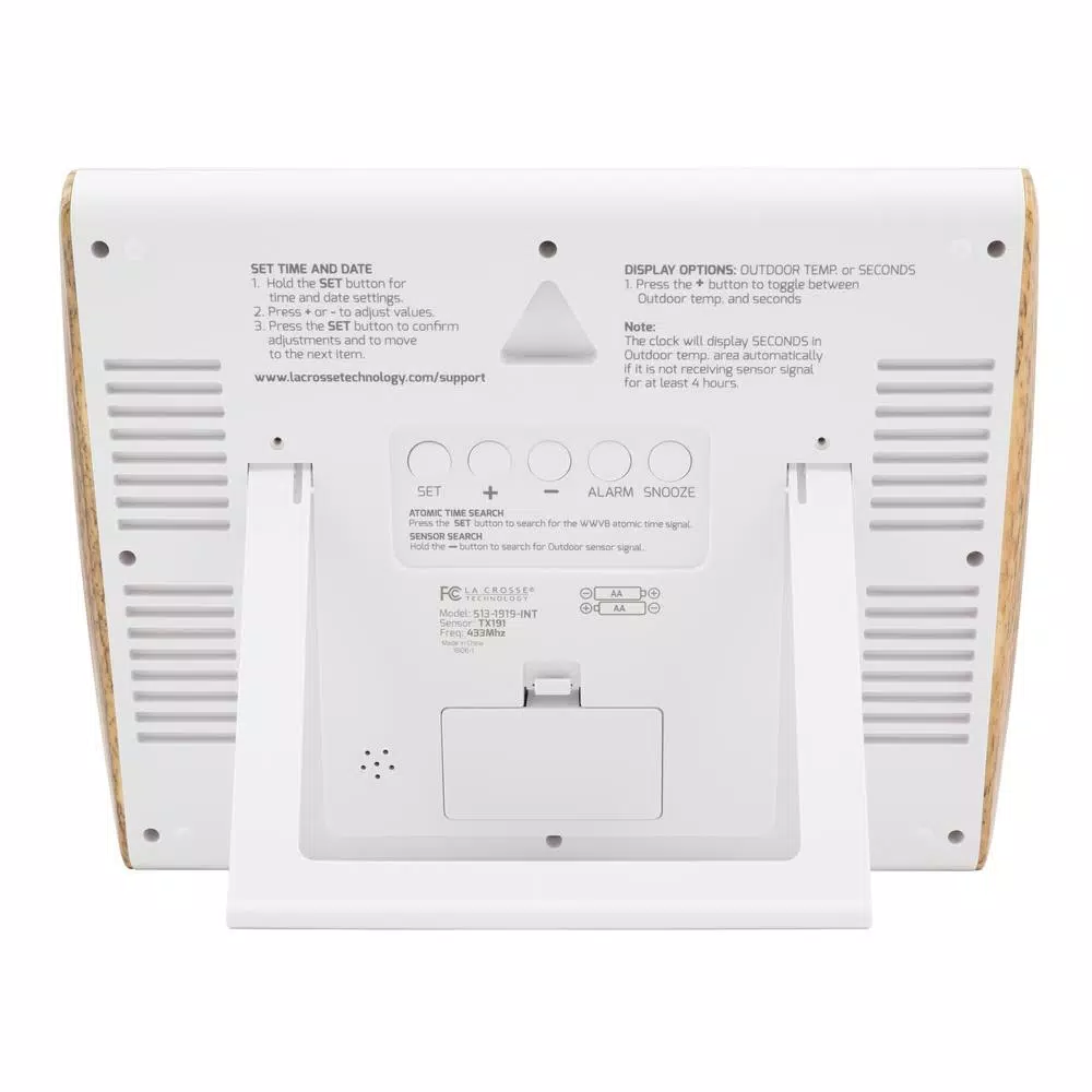 Unique faux wood-sided digital clock automatically sets your time accurately and automatically resets during Daylight savings. Large LCD displays current time, active alarm, calendar date, and includes room temperature with humidity. Includes a weather-resistant transmitting sensor to use outdoors to send wireless outdoor temperature to the clock. Features tendency arrows and settings to any of the 7 continental US time zones (AST to HAT.) Portability and convenience with its battery operation (not included) and optional stand alone or hang onto a wall.