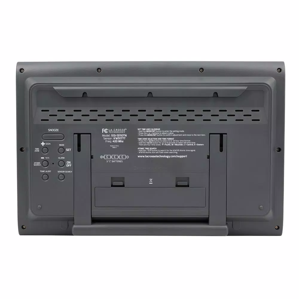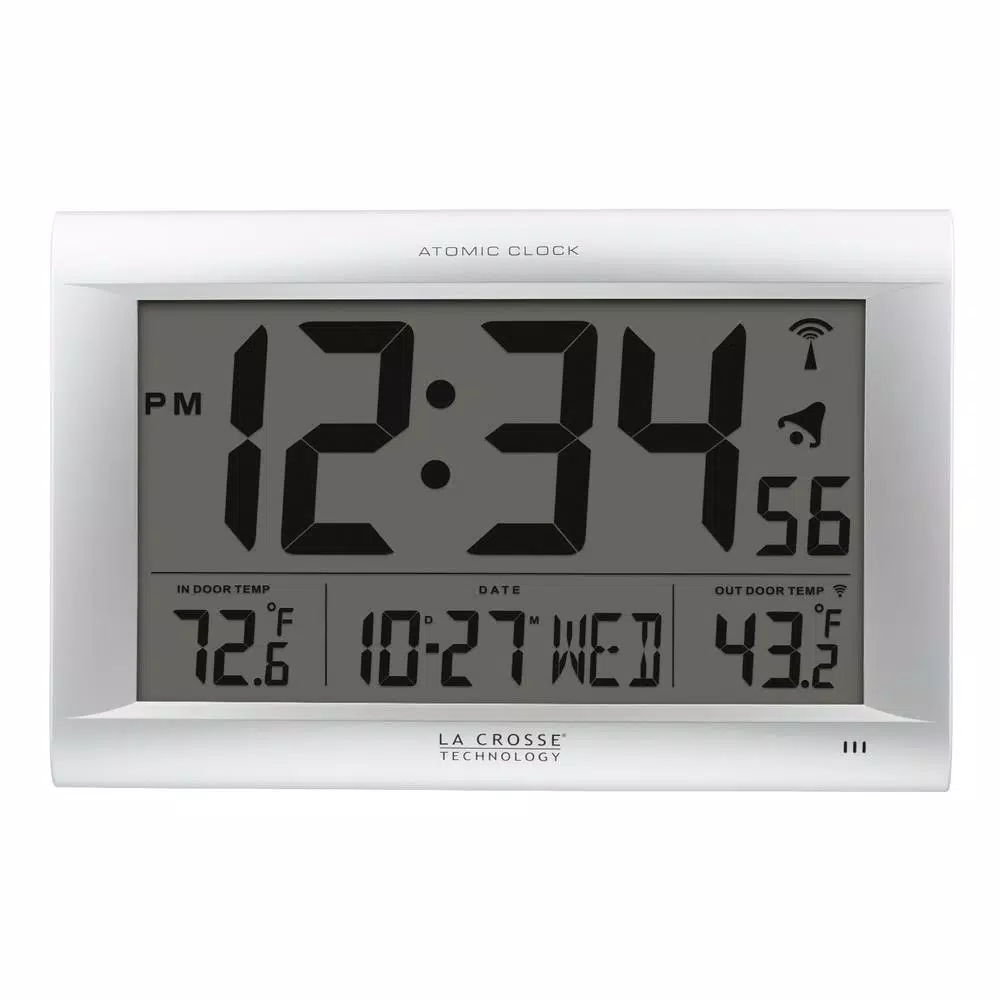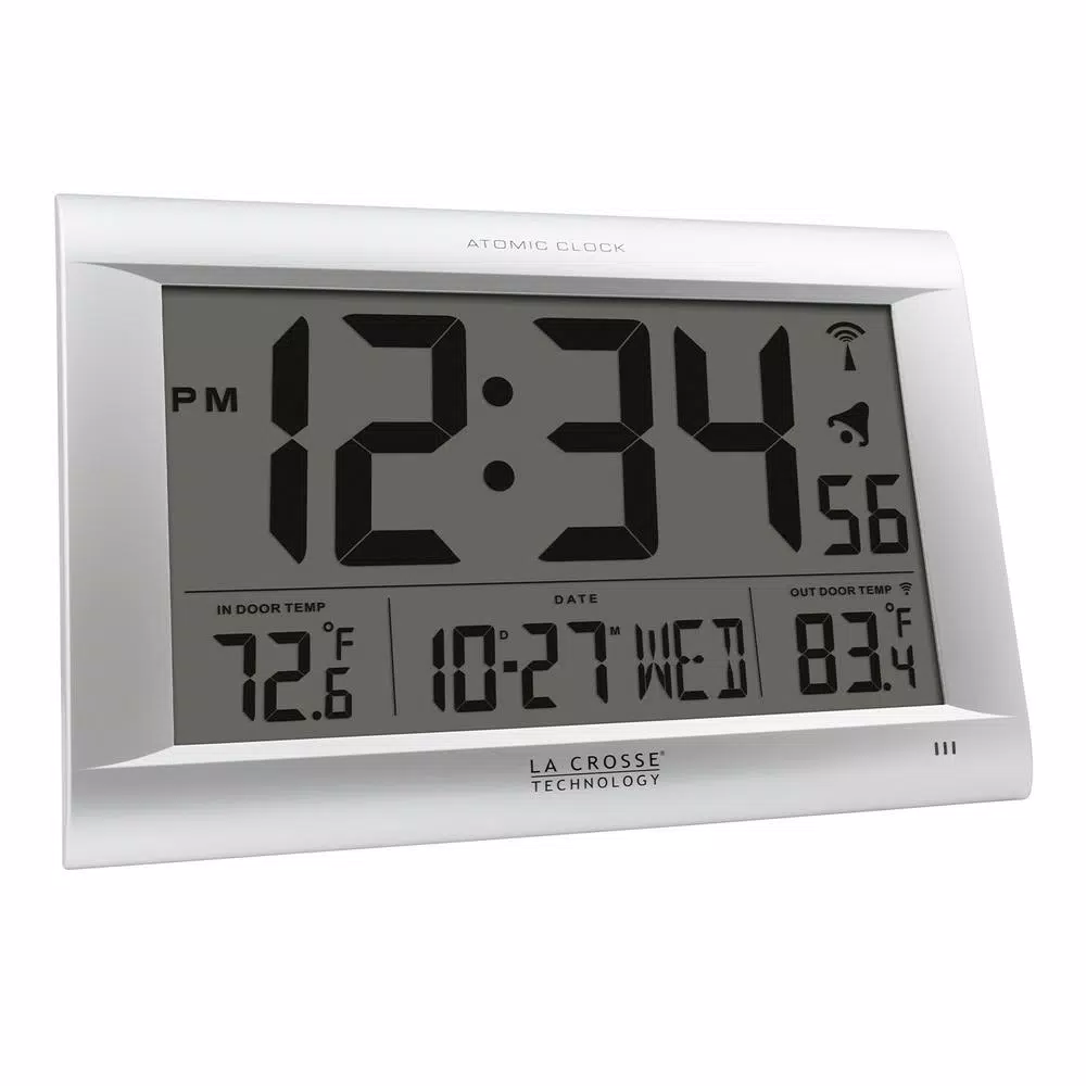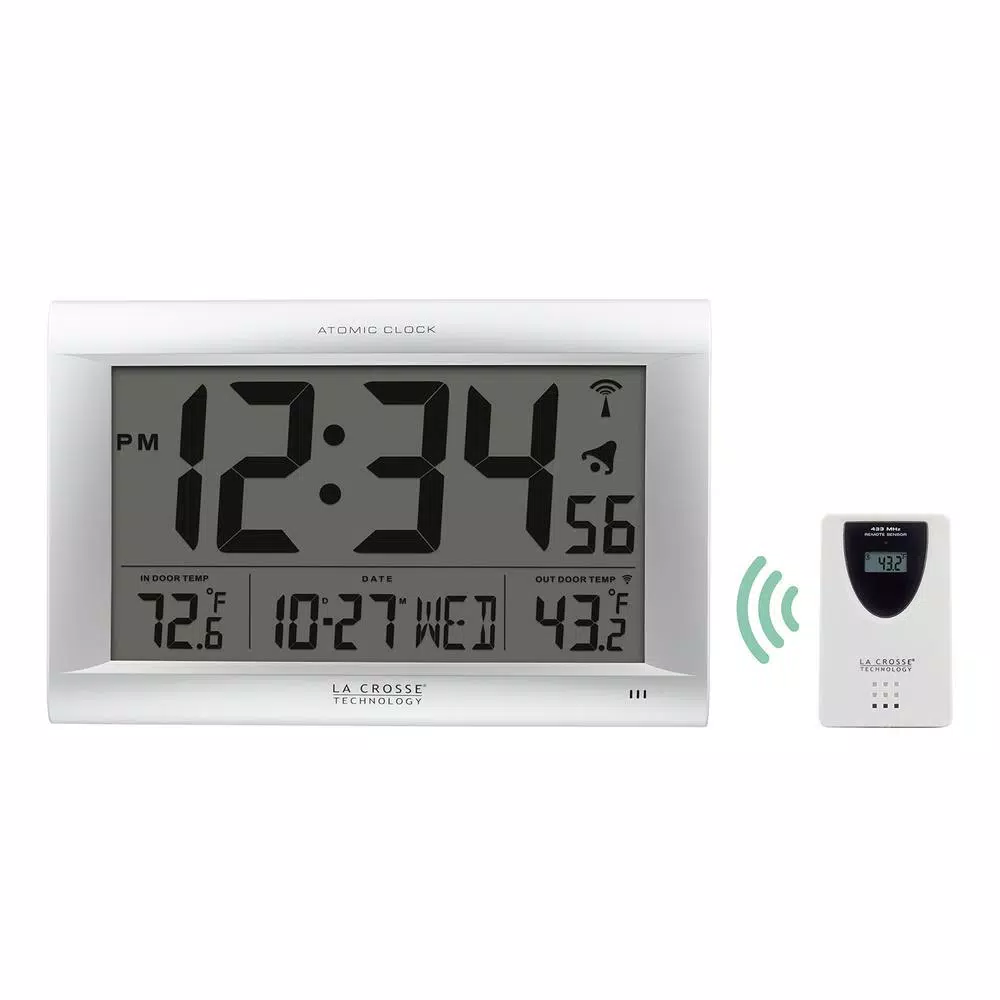 Extra large digital clock features self-setting WWVB time and DST reset. Wireless reception from included outdoor sensor transmitting from 330 ft. range (batteries not included.) Calendar date with indoor temperature monitoring (F/C). View in 12 or 24 hour time. Can be wall hung or desktop standing.