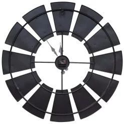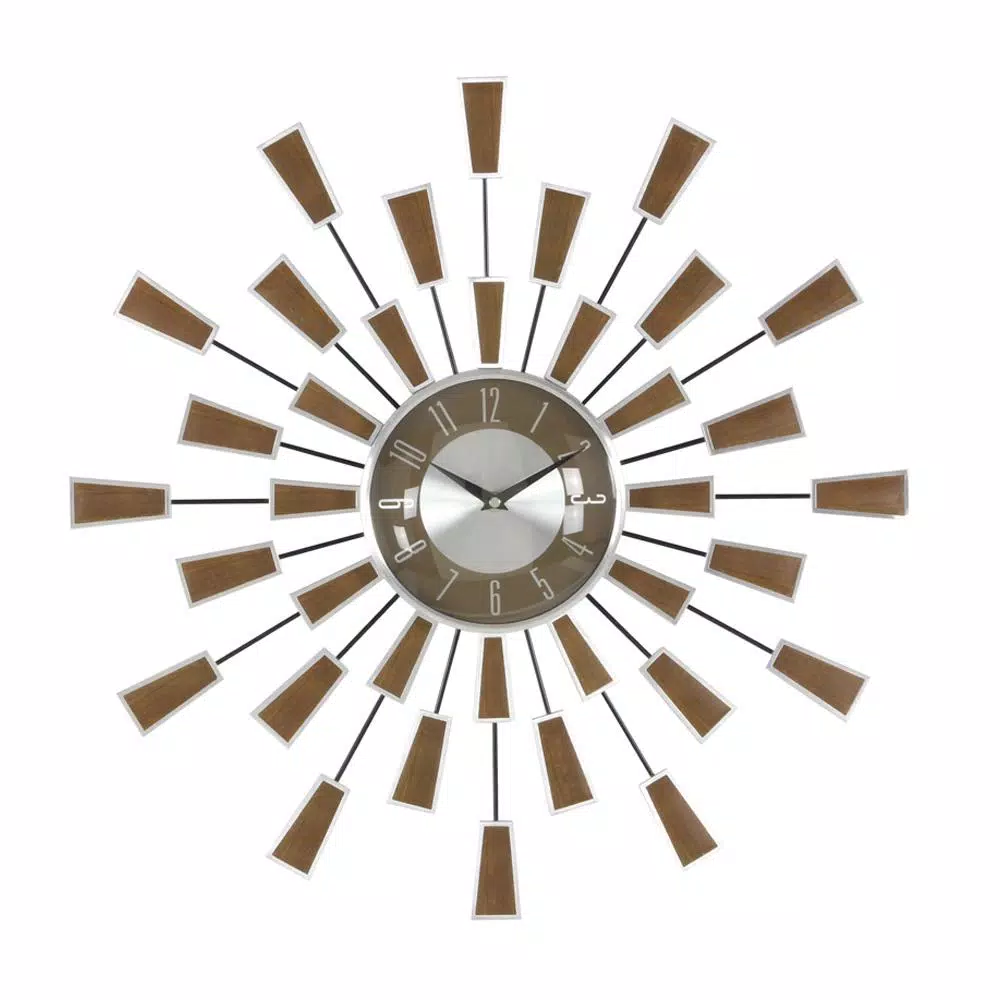 This wall clock features a modern style with its stunning sunburst design. It is crafted with a series of metallic black iron rays with flat metallic brown tips that reveal a unique and impressive style. This decorative clock features a classic black clock face that goes well with its white Arabic numeral markings.