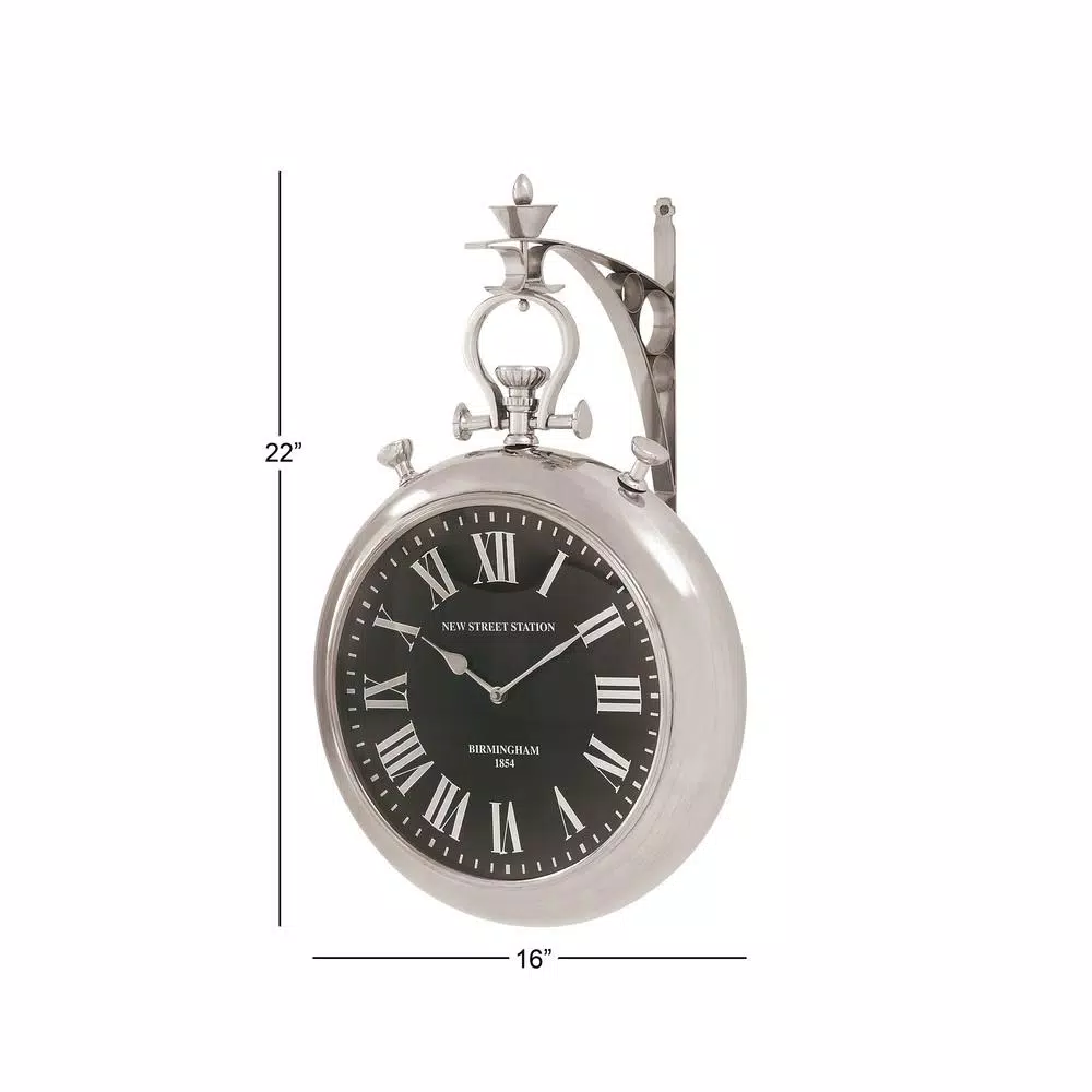 This silver-finished wall clock features a pocket-watch-style design perfect for vintage settings. It has a classic round frame that is securely suspended on an aluminum wall bracket. The decorative crown, loops and buttons add a classic vintage finish to this decorative timepiece.