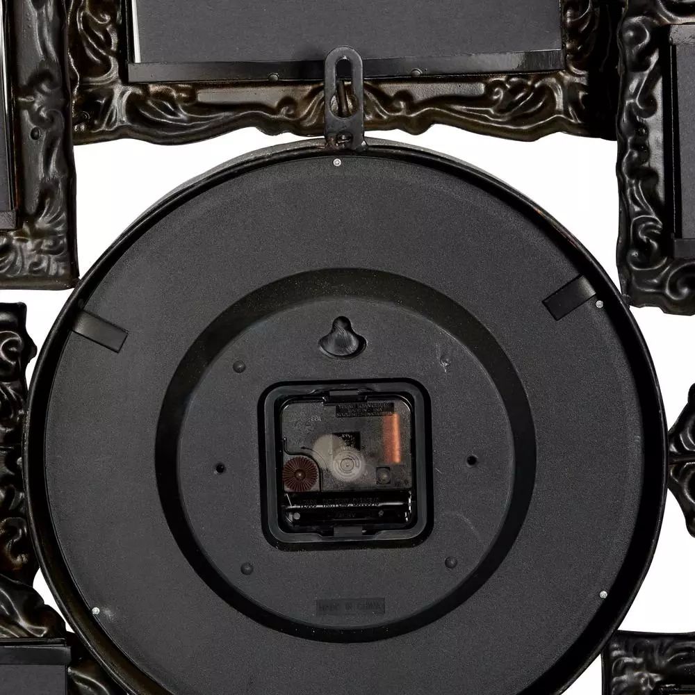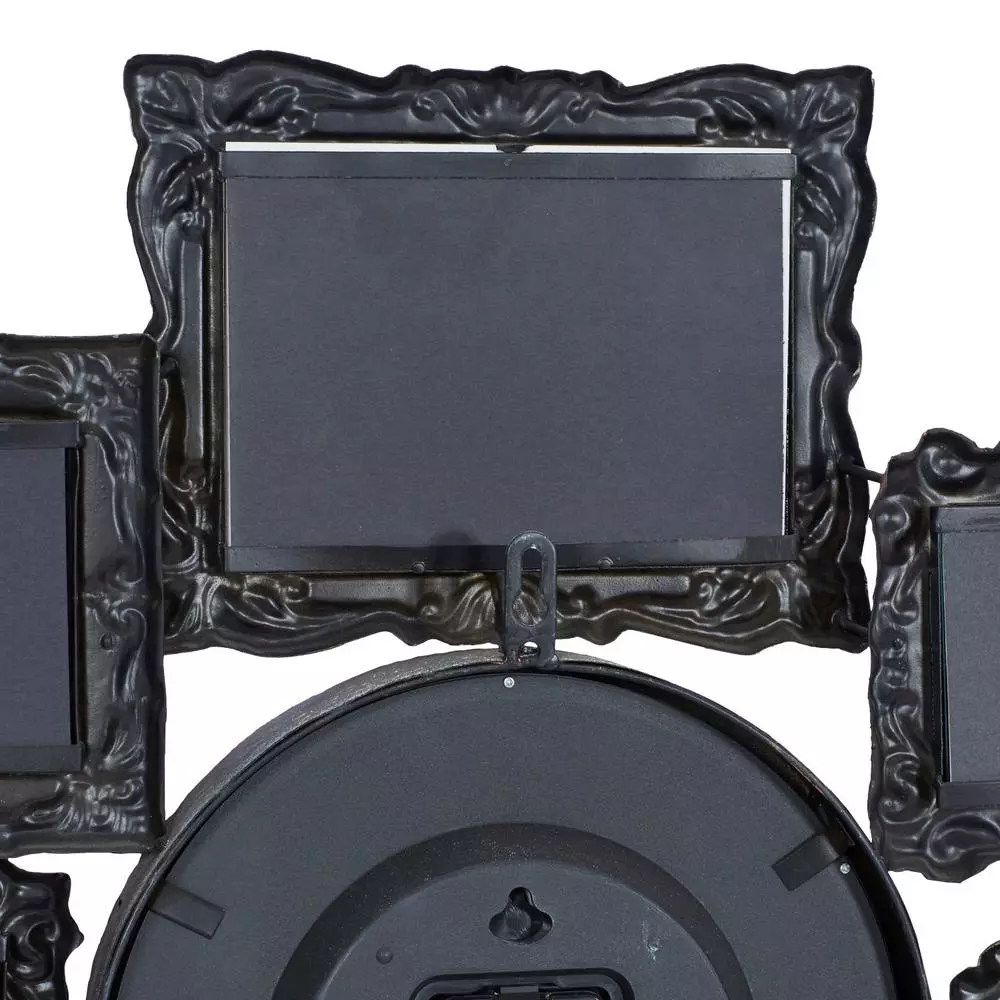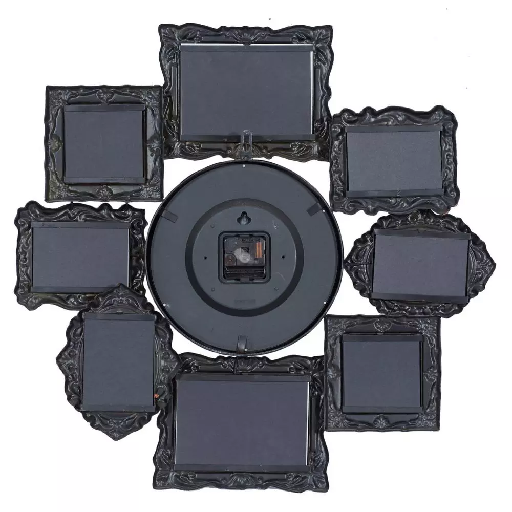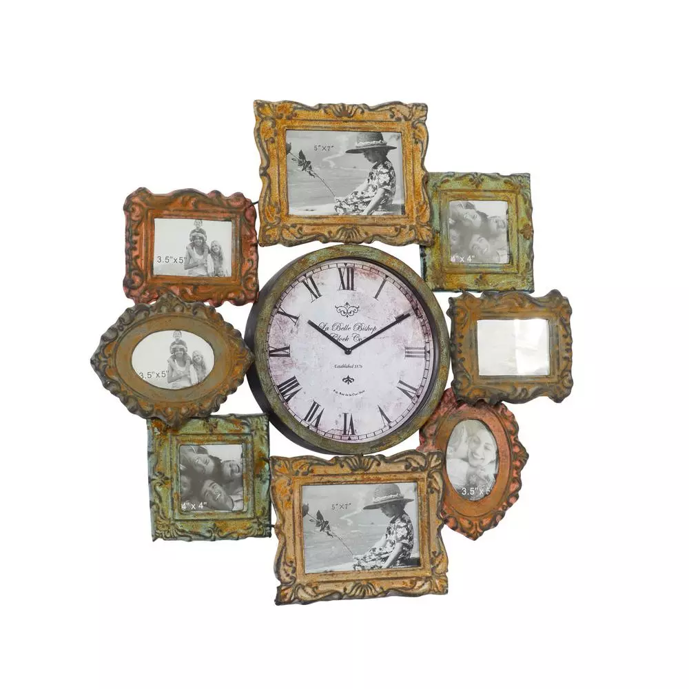 This Victorianesque wall Montage of 8 photo frames and Center Clock sits an impressive 25 in. high. It boasts dramatic finishes, using Distressed Ivory, Verdigris and Russet Hue Iron colors. Added embellishments include Vintage Style Graphics, Scalloped Relief Frame Moldings and Roman numerals.