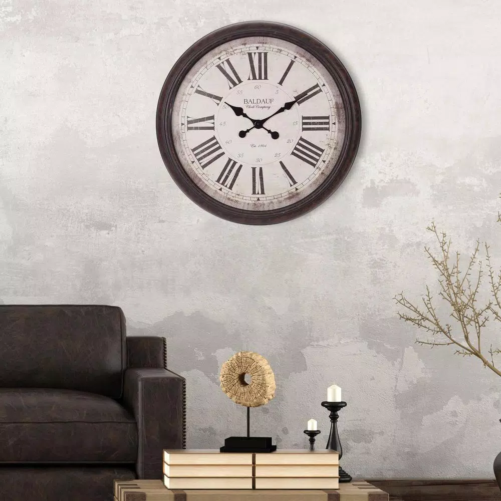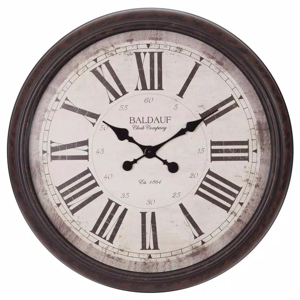 Add a classic touch to you decor with this 30 in. Antique Bronze Baldaud Roman Numeral Wall Clock. Inspired by vintage time pieces, this wall clock blends traditional and vintage style seamlessly. Constructed of durable plastic injection in an antique bronze finish, the clock face features an antique white background with distressed roman numerals. Hangs securely to any wall surface with durable hanger on back. Requires one AA battery.