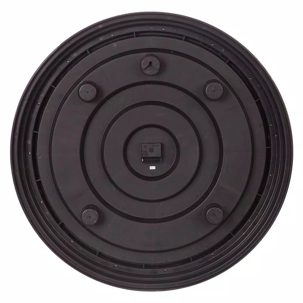 - Wide clock frame is finished in distressed black and features a beveled profile