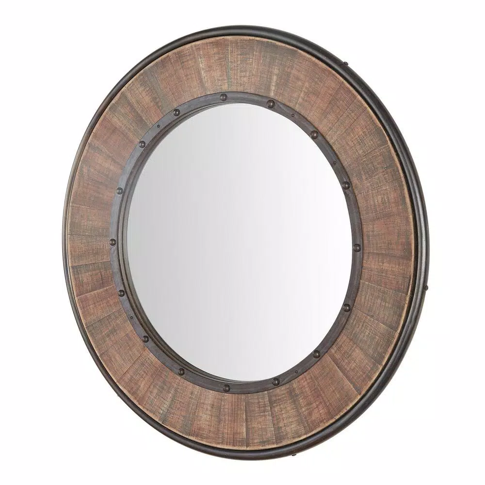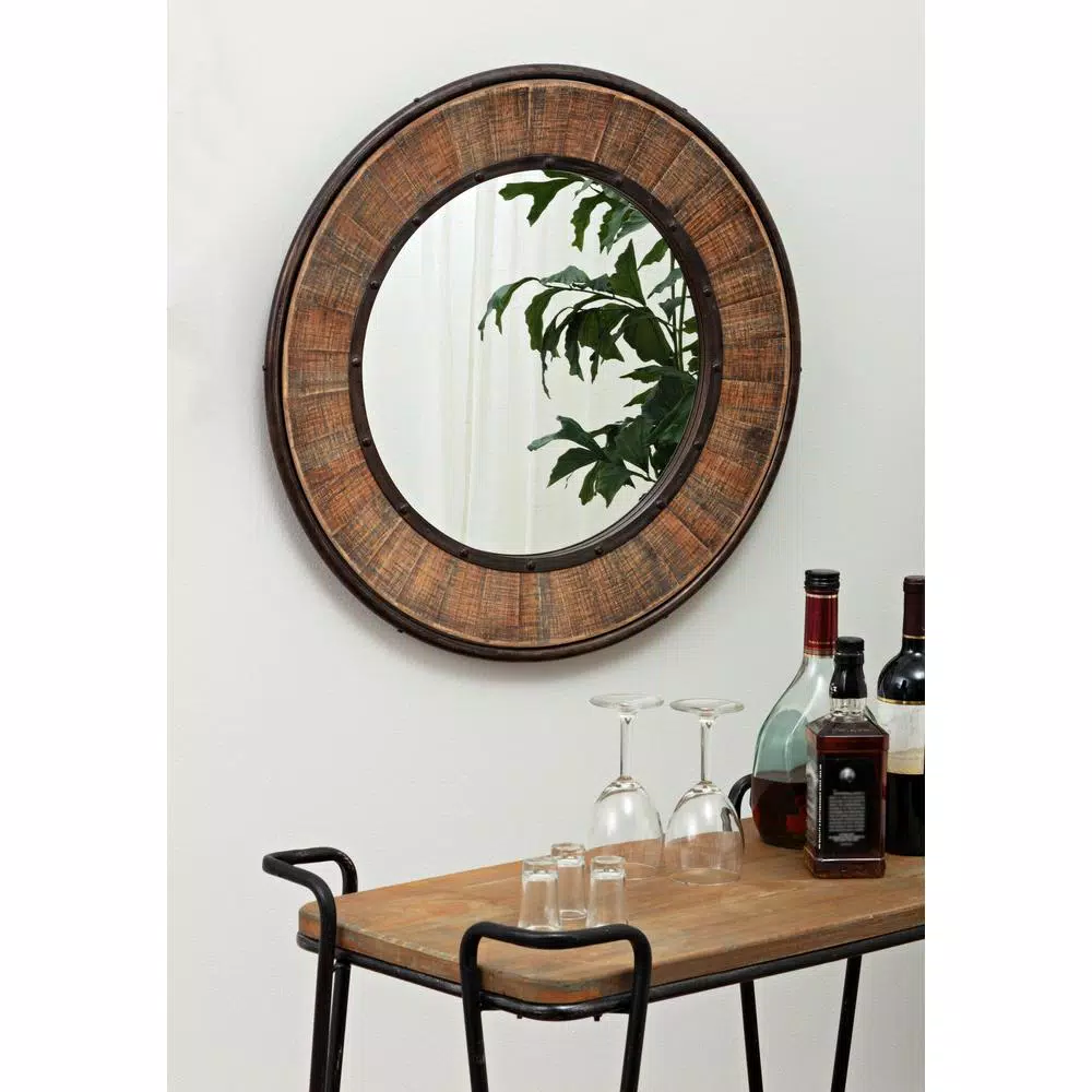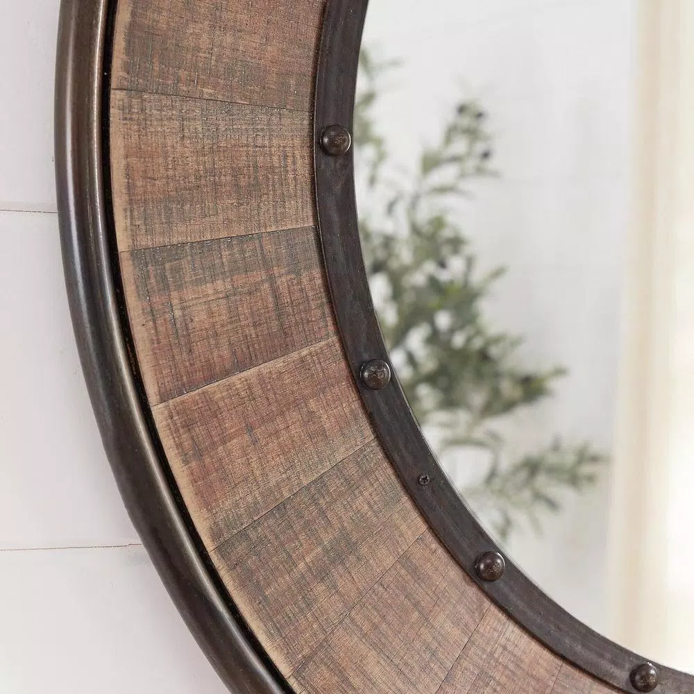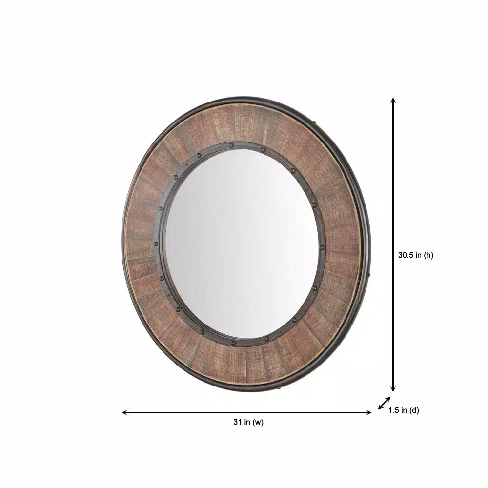 Add a touch of rustic charm to any wall in your home with the 31 in. Diameter Medium Round Farmhouse Accent Mirror with Wood Finish from Home Decorators Collection. It features a sturdy metal frame with a distressed wood finish that complements a farmhouse-style decor. With two D-rings on the back, this accent mirror is ready to display in your living room, entryway or bedroom. Use a soft cloth with standard glass cleaner to keep this decorative mirror clean and shiny.