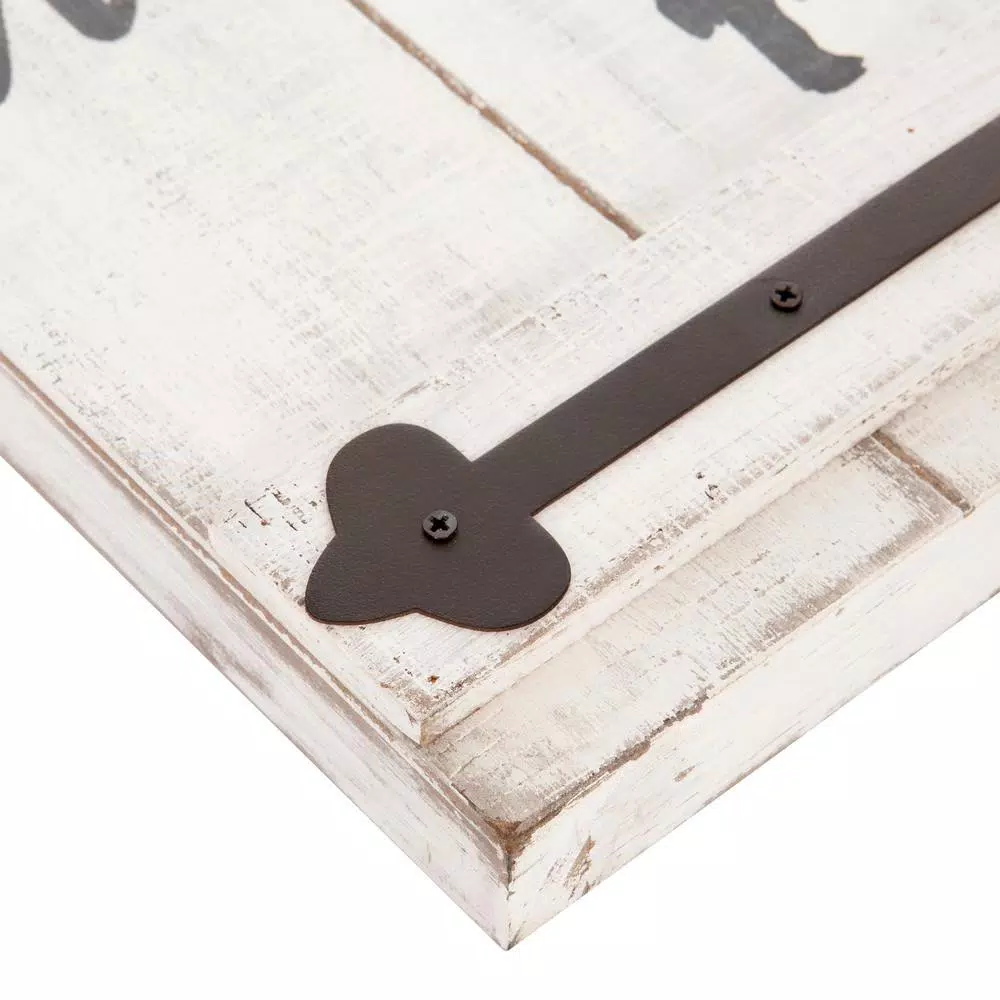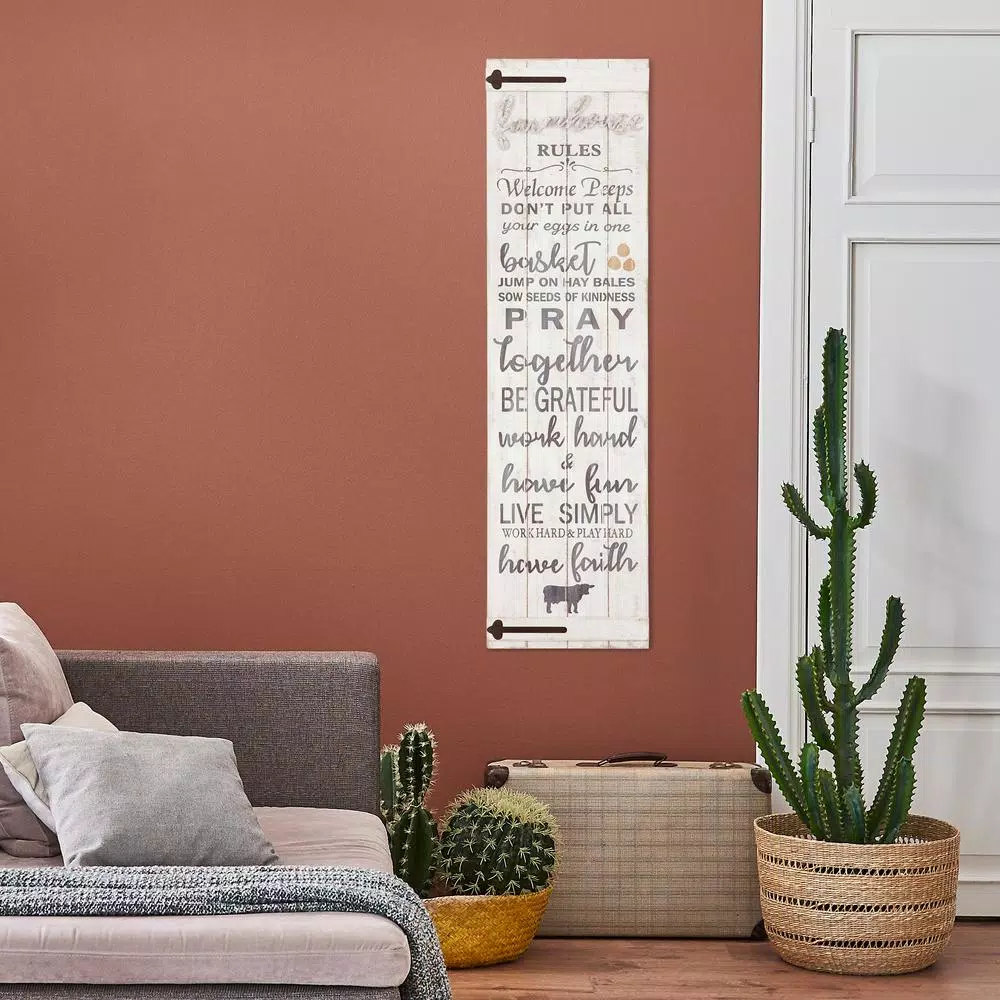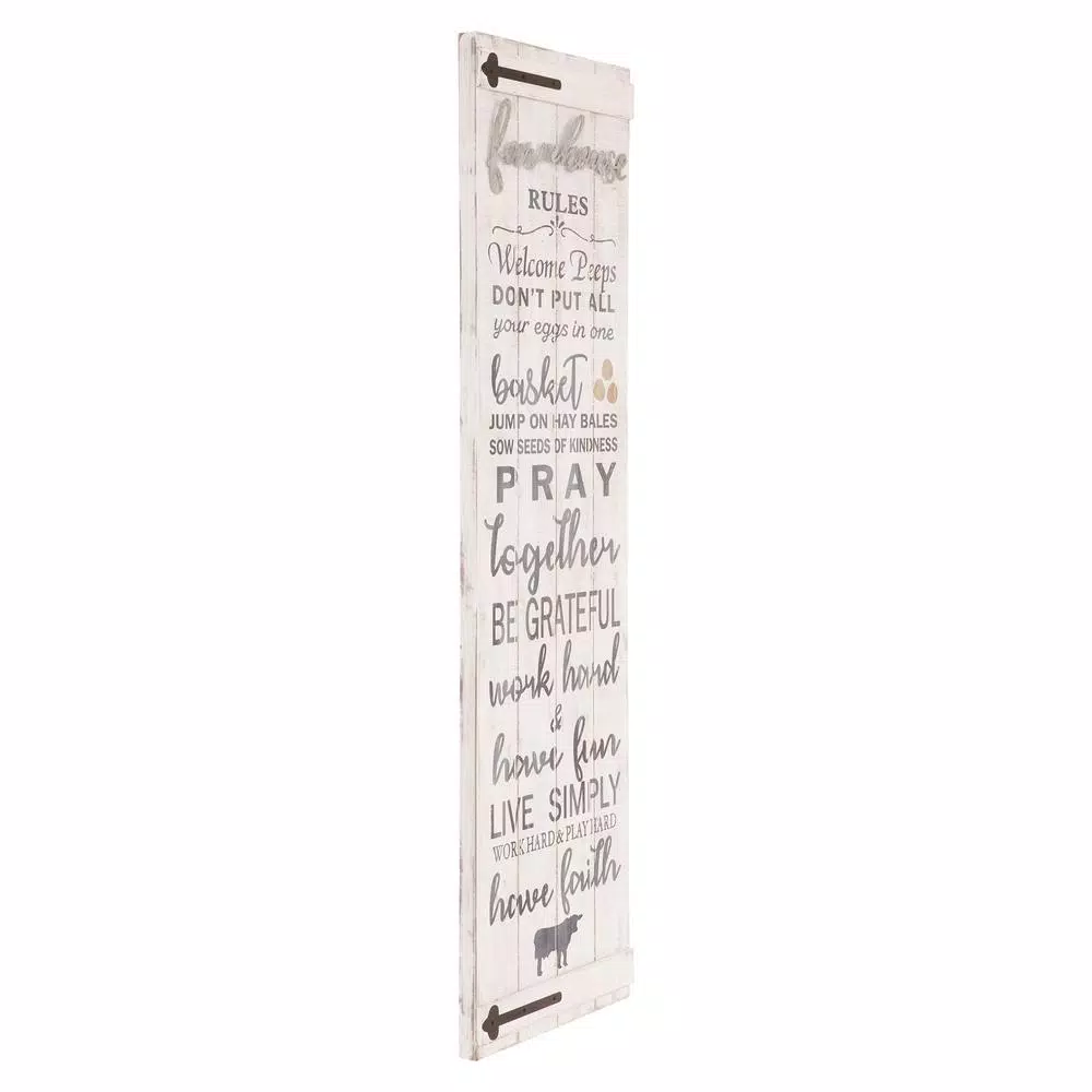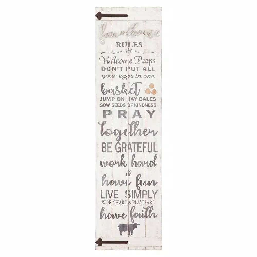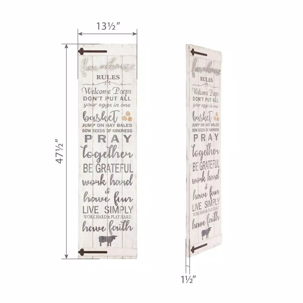 This rustic wood wall art will add farmhouse charm to your decor and serve as a visual reminder of you and your family’s values every time you take a glance. The Farmhouse Rules Rustic Wood Plank Barn Door Wall Decor features whimsical typography on a lightly distressed brushed white wood plank background. Inspired by rustic barn doors, this kitchen sign features black coated metal door hinges adding an antique element. Hangs securely to any wall surface with two industrial strength wall hangers and ships ready to mount. Set a warm and inviting atmosphere with this 47.5 in. x 13.5 in. wall decor piece. This wooden sign is also perfect for new homes and wedding gifts.