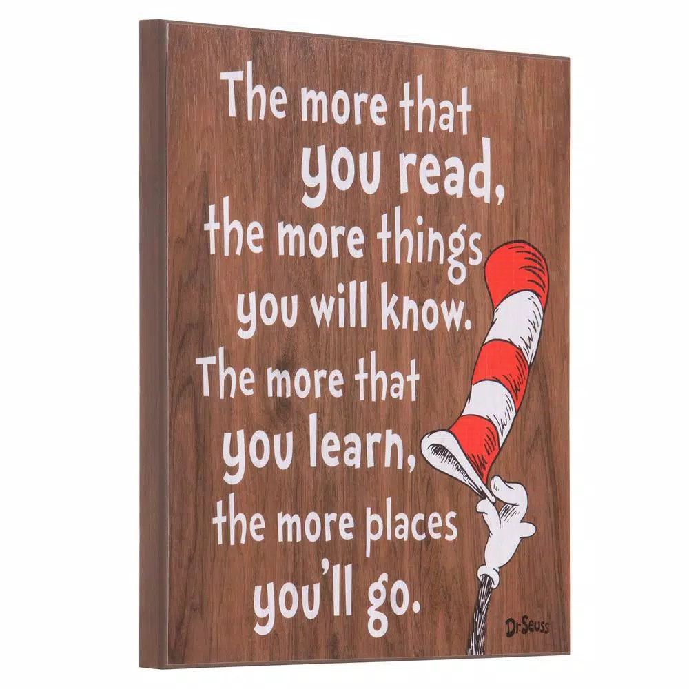 Turn your little one’s bedroom into a dream-come-true with this 18×18 Dr. Seuss The More You Read Cat In The Hat Wood Wall Art. From decorating the new nursery to adding a touch of whimsy to the play room, this baby or kids’ wall decor lends a delightful typography design and adorable illustrations of their favorite Dr. Seuss character, The Cat in the Hat. Remind them that “You can find magic everywhere you look… All you need is a book” with this vibrant graphic art print over rustic woodgrain in a rich mahogany finish. Dr. Seuss artwork hangs securely to any wall surface with industrial hangers on the back that make installation a snap.