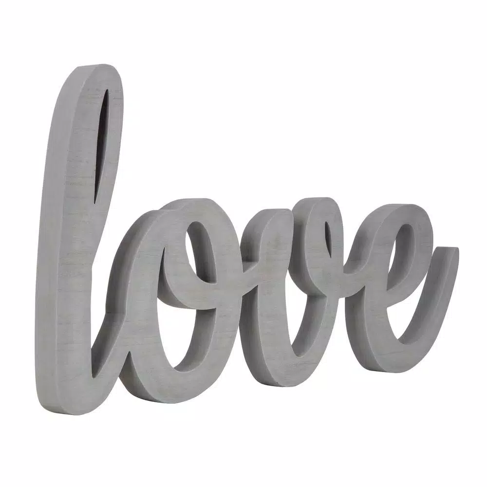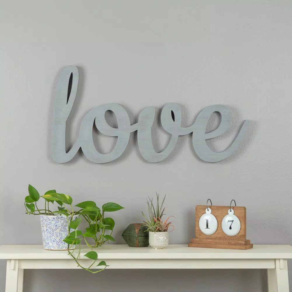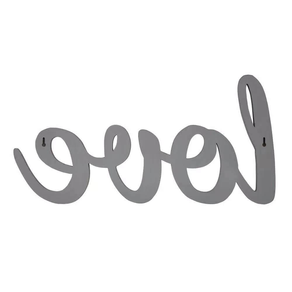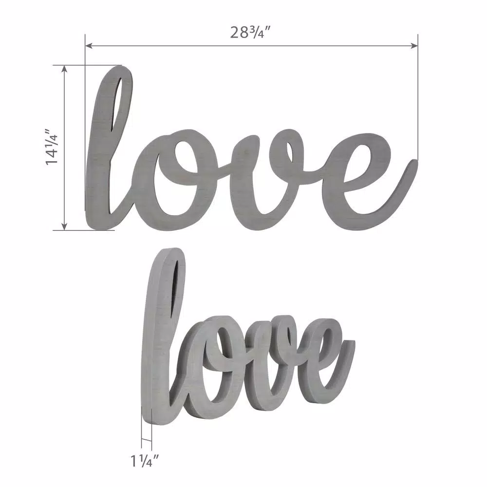 This handcrafted Grey Script Love Wood Word Cut Out will make a touching statement hanging on your wall or freestanding on any table, mantel or shelf. Crafted from solid wood, this word wall decor piece is 1.2 in. deep adding value and allowing it to stand freely. Finished in an elegant washed grey finish, this gorgeous accent piece adds a rustic farmhouse feel to any bedroom, living room, entryway or dining room. Ships ready to hang with two drop in keyhole brackets that make hanging simple and hassle free. Adorn your walls with this delightfully over-sized sign measuring just under 29 in. wide x 14 in. tall. It’s perfect for the kids room or nursery and even weddings and events for a sentimental photo shoot.