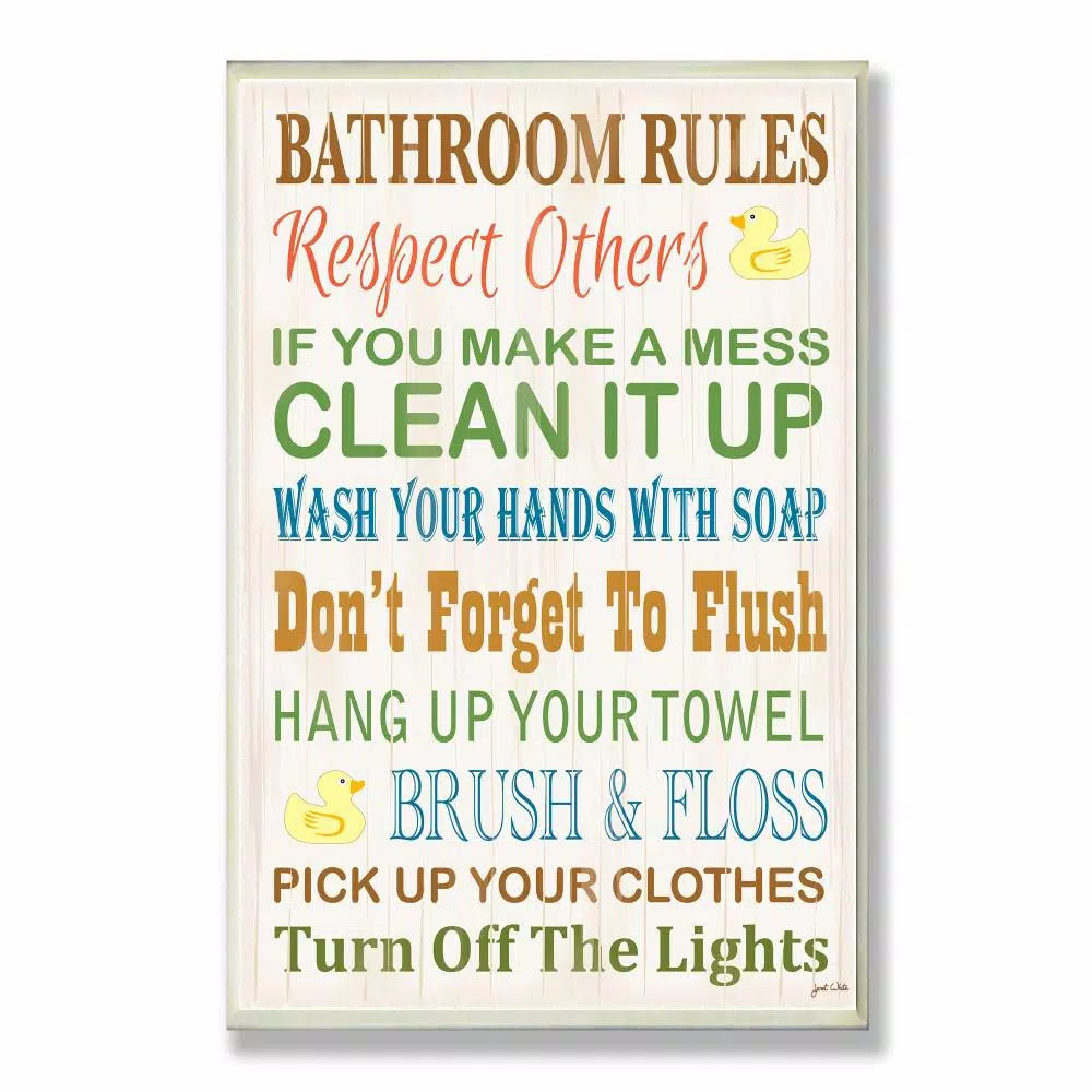 Simple and elegant, this Stupell Industries Bathroom Rules Typography Rubber Ducky by Janet White Printed Wood Wall Art personalizes your home environment.